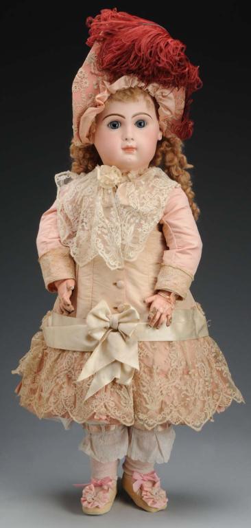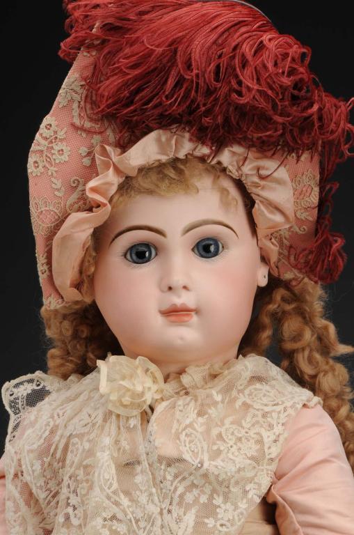Description Closed mouth, bisque head, blue paperweight eyes, and stamped on back "Depose Tete Jumeau BteSGDG15". Original fully-jointed and unmarked body. Doll has a break and re-glue to forehead and has been redressed. Condition (Good). Size 32" T.