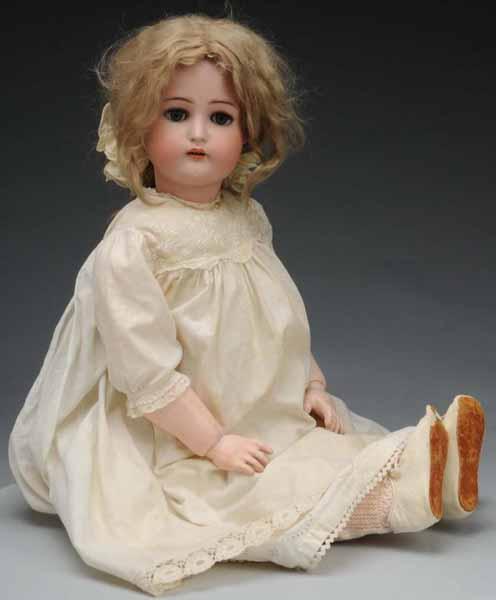 Description Germany, Ca. 1910. Bisque socket head incised "K & R Simon & Halbig", sleeping eyes wtih eyelashes, molded eyebrows, pierced ears, open mouth, original blonde mohair wig. Original K & R jointed composition body. Vintage clothing, original shoes and stockings. Condition (Excellent). Size 29" T.