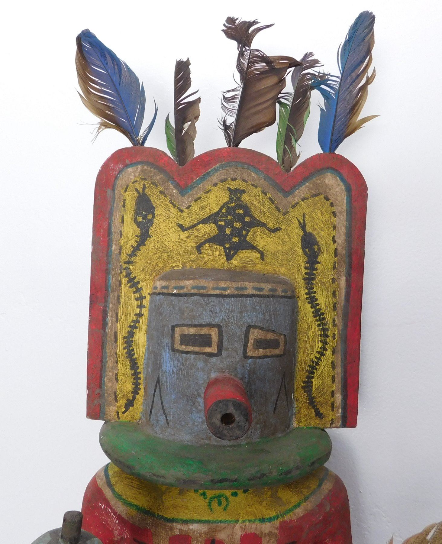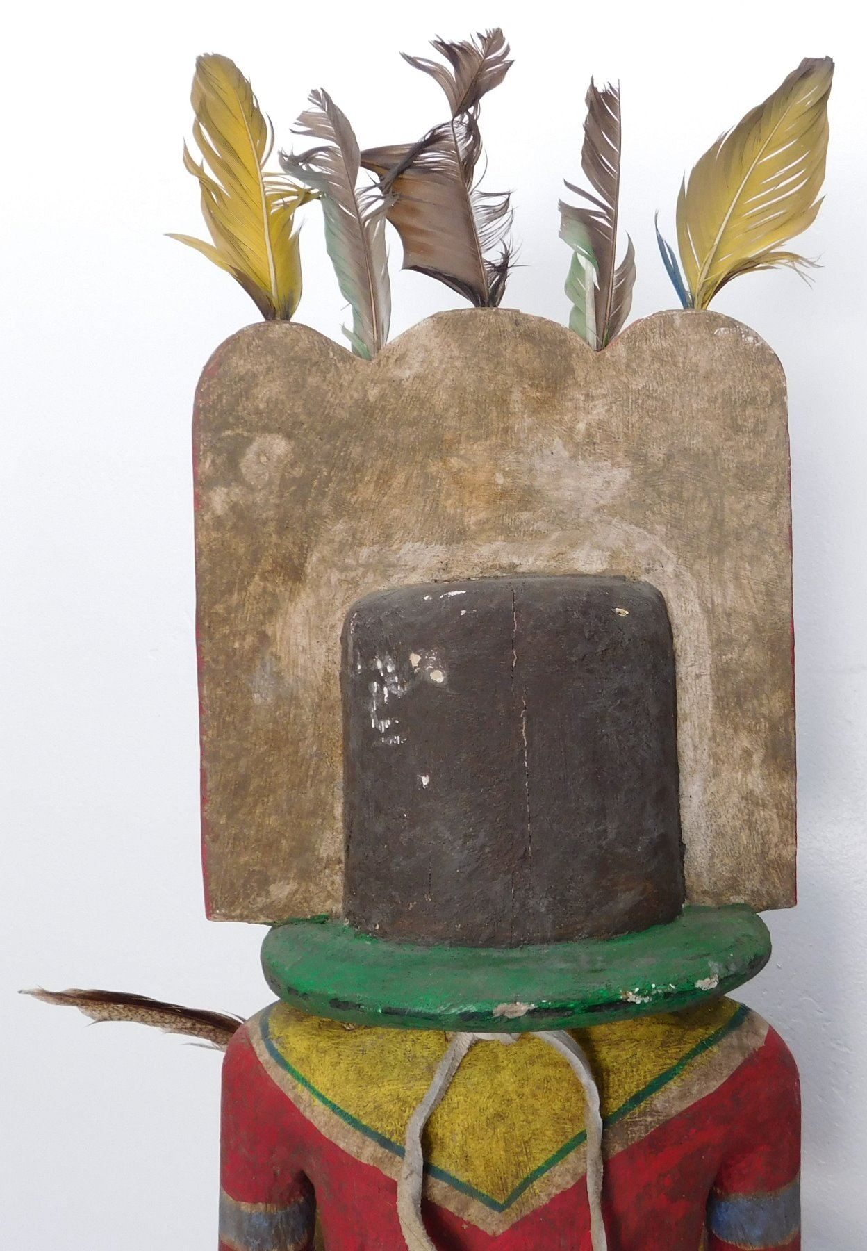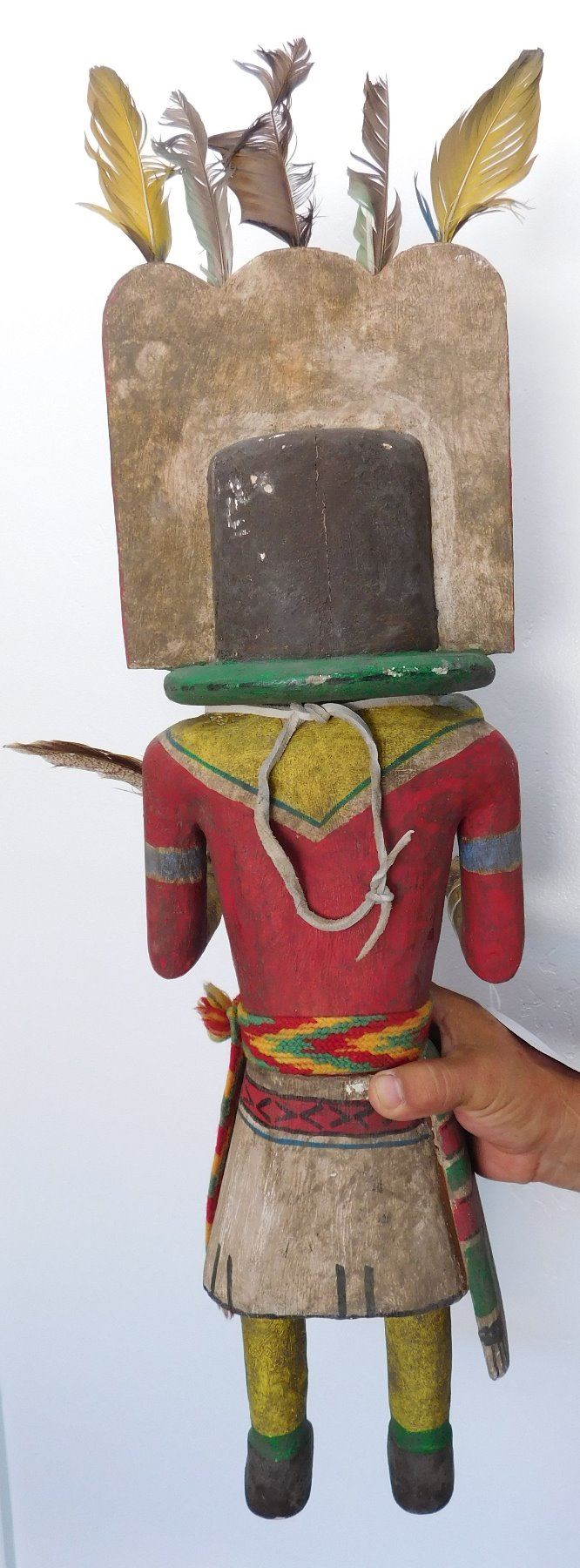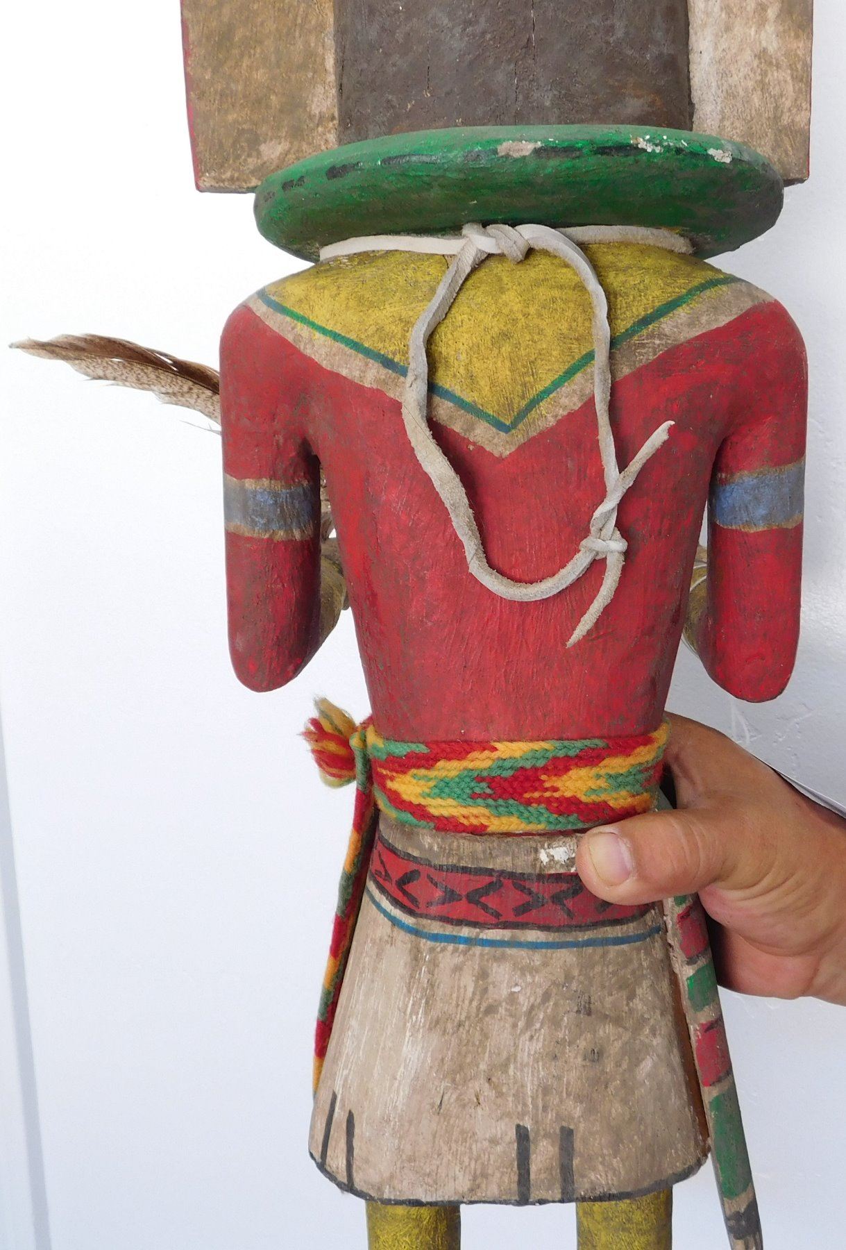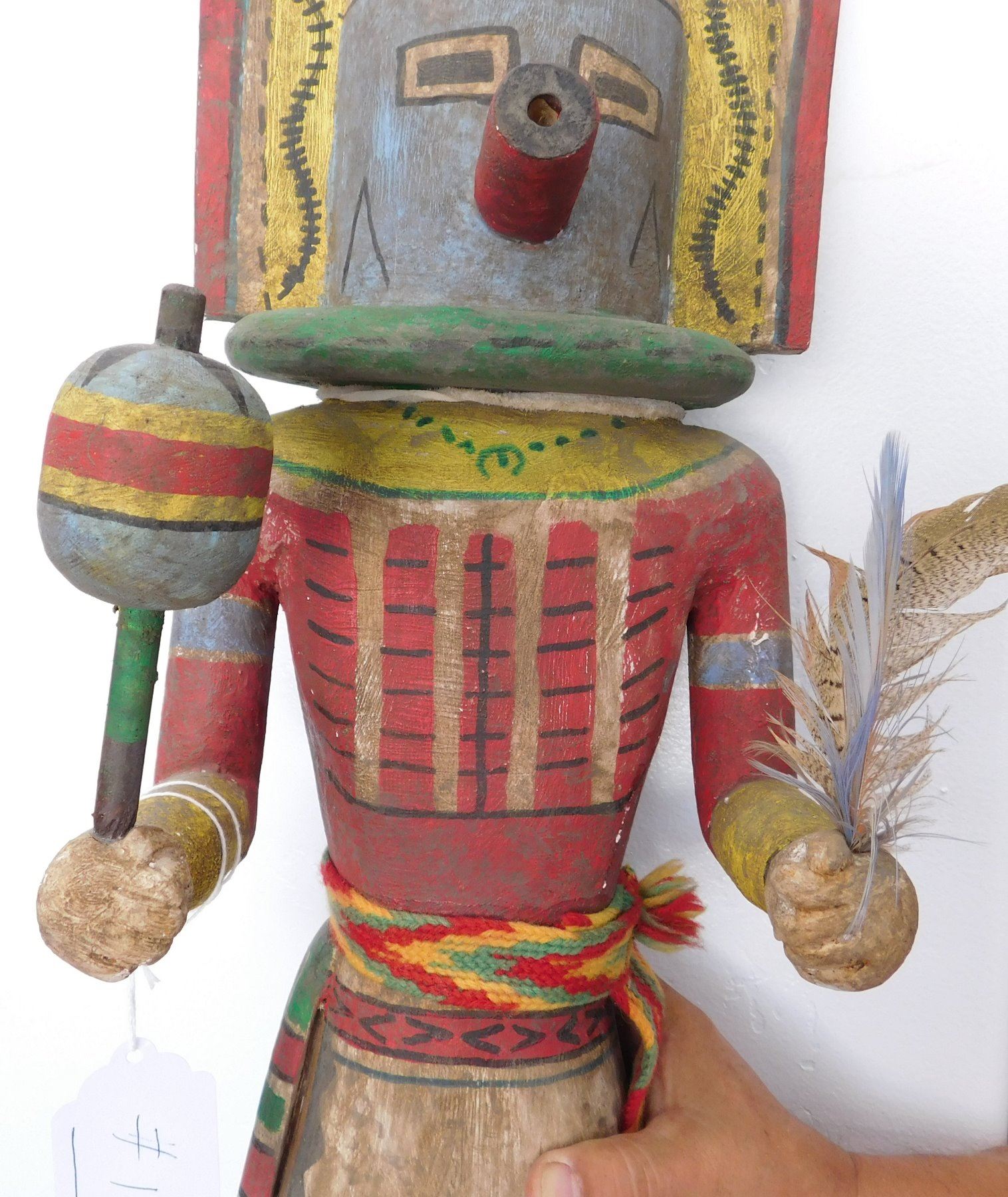Large Kachina Doll, circa 1940s. Made of wood, paint and cloth, the item measures 8" x 8.5" x 30" tall. Hopi, Arizona. Large and fancy kachina doll. Condition: Minor nicks and wear, see images. Shipping: $60.00 USA estimate only w/insurance and signature, due to size.