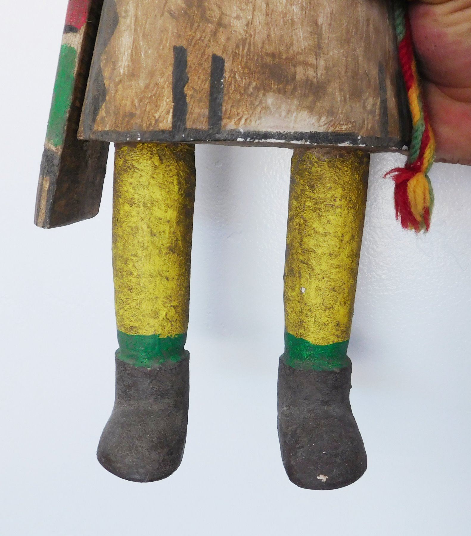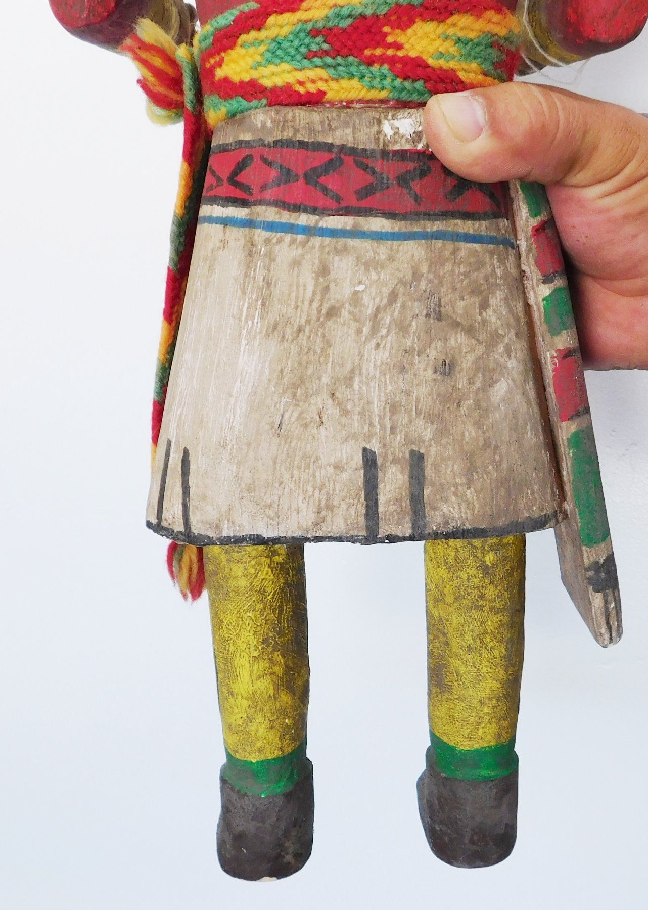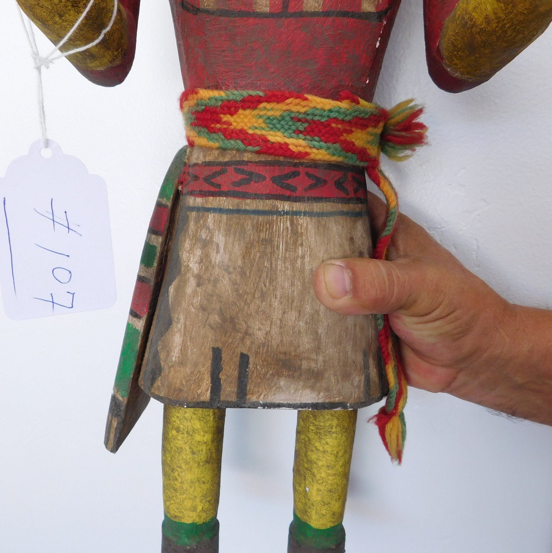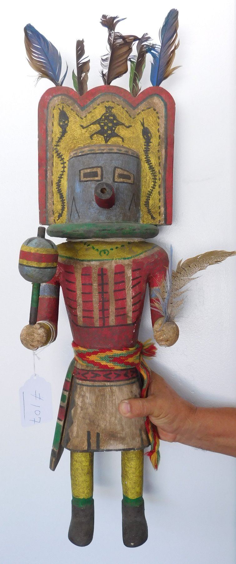 Large Kachina Doll, circa 1940s. Made of wood, paint and cloth, the item measures 8" x 8.5" x 30" tall. Hopi, Arizona. Large and fancy kachina doll. Condition: Minor nicks and wear, see images. Shipping: $60.00 USA estimate only w/insurance and signature, due to size.
