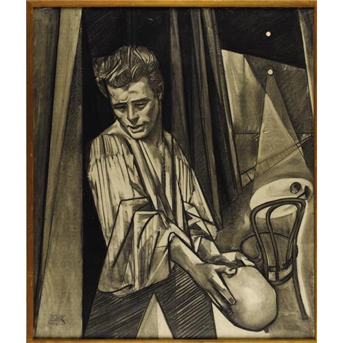 <B>Large Kenneth Kendall Charcoal Drawing of James Dean.</B></I> Circa 1956, this large charcoal cubist drawing features Dean as Hamlet, a role he played while briefly studying acting at UCLA in 1951. Dean was panned in reviews of the production, but received encouragement from others to further his acting studies in New York. The drawing is framed to an overall size of 34.5" x 41" and in Excellent condition. <I>From the James Dean Museum archive.</B></I>