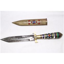Vintage Knife Blade with Etched Brass Sheath and Handle are Etched and Gem Stoned