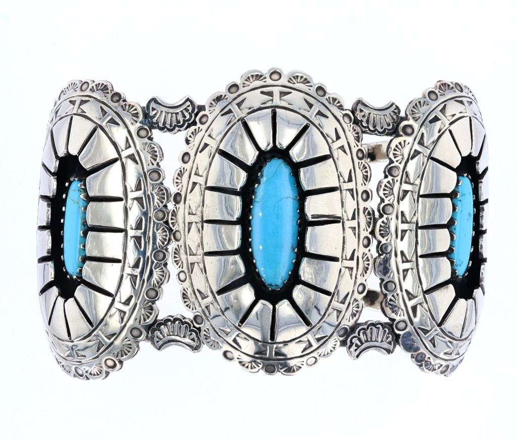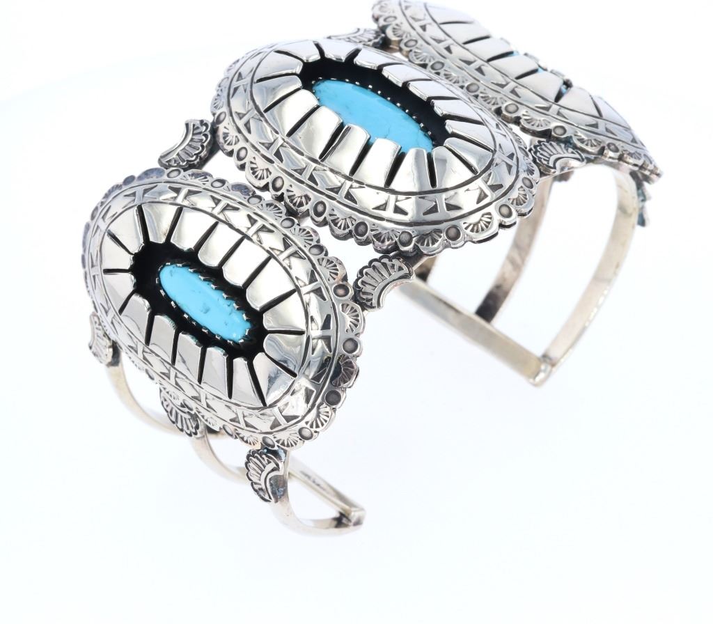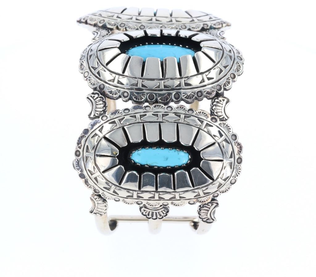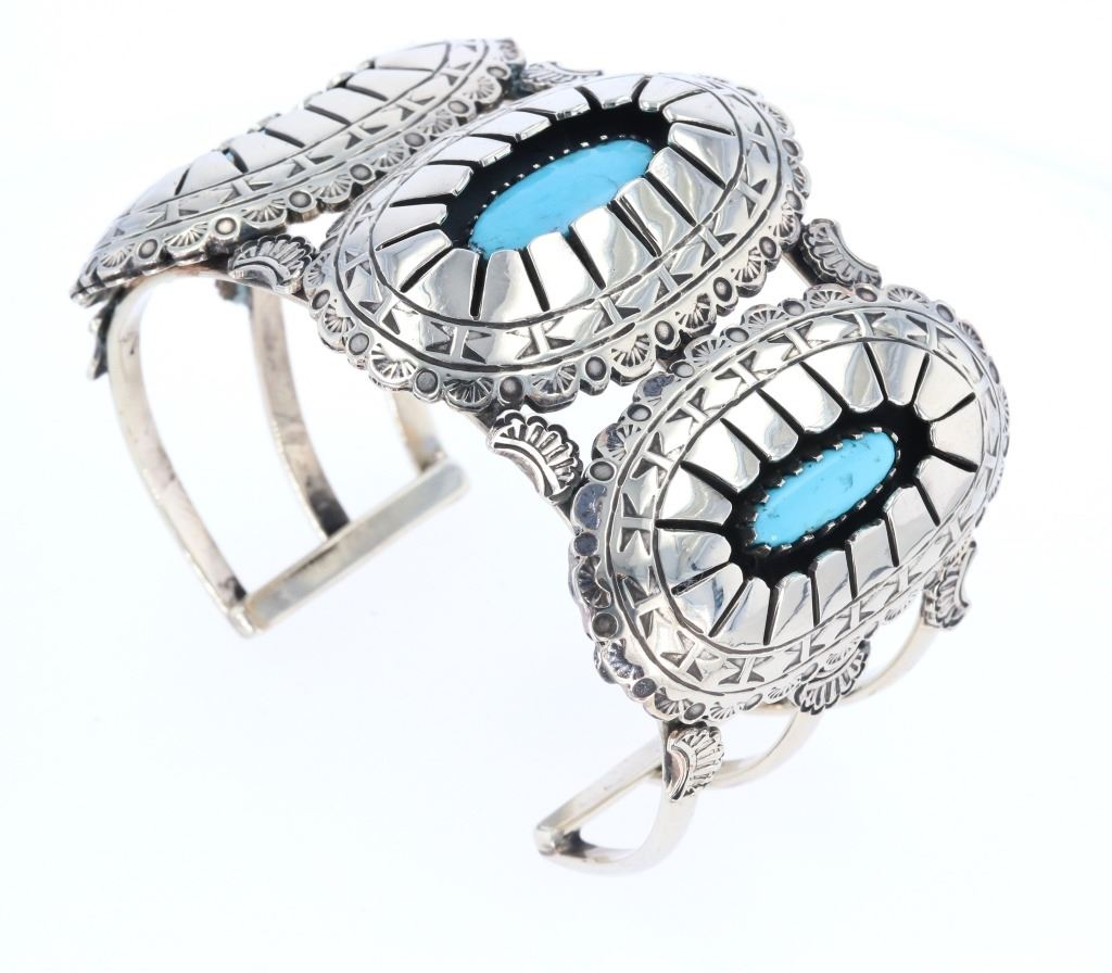 Featured in this lot is this alpaca silver sleeping beauty turquoise shadowbox bracelet design from Lakota artist Armand American Horse. The bracelet features alpaca silver scalloped pendants set into the face of the bracelet with three oval cut sleeping beauty turquoise cabochons inlaid into a shadowbox decoration. The Armand American Horse hallmark can be seen on the underside of the bracelet. The condition of this bracelet is good, with no obvious signs of damage. The measurements of this bracelet are 2 1/2" x 3 1/8" x 2" and the circumference is 5 1/2".