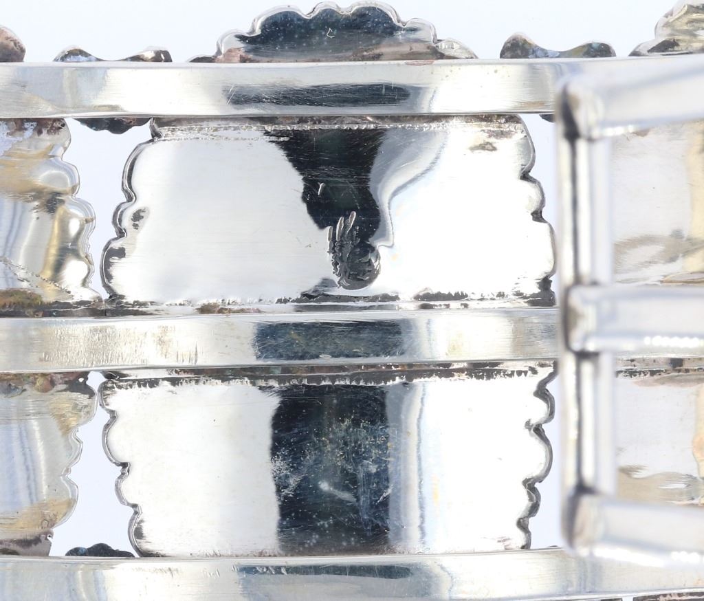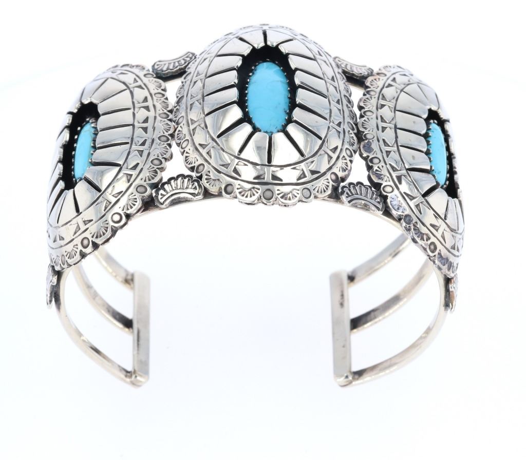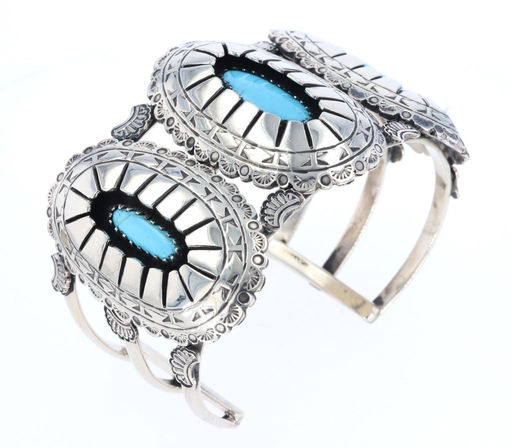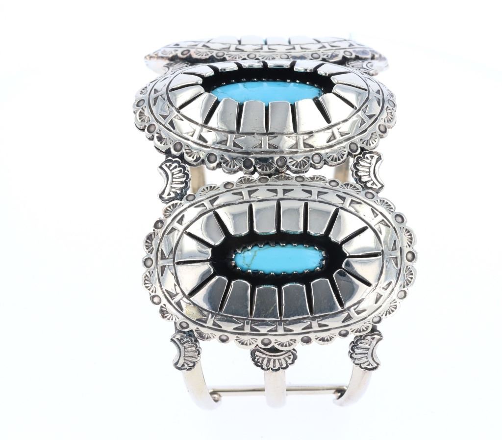 Featured in this lot is this alpaca silver sleeping beauty turquoise shadowbox bracelet design from Lakota artist Armand American Horse. The bracelet features alpaca silver scalloped pendants set into the face of the bracelet with three oval cut sleeping beauty turquoise cabochons inlaid into a shadowbox decoration. The Armand American Horse hallmark can be seen on the underside of the bracelet. The condition of this bracelet is good, with no obvious signs of damage. The measurements of this bracelet are 2 1/2" x 3 1/8" x 2" and the circumference is 5 1/2".