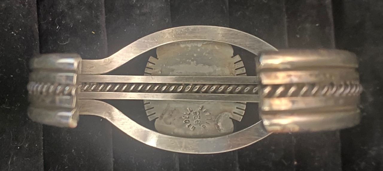 Bracelets measurements are opening, inside circumference, height. Weights are in Grams and are weighed to the best of our ability. The term signed means that, in our opinion, the signature is by the artist. All dating, Turquoise and hallmark attributions are to the best of our knowledge. Attributions are subjective and should be taken as such. Attributions in the description of any lot is left to the buyer to determine accuracy and the gallery is not responsible for any errors or omissions.