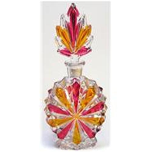 Produced in post WW II West Germany this large,heavy, genuine Lead Crystal perfume bottle or decanter is cut with V shaped rays, emanating from the center, alternatively painted, between clear grooves, in red and yellow on both sides. The arrow shaped stopper is similarly adorned. Measuring 9 1/2 inches tall x 4 inches across its middle.The decanter has a round circular shape below the neck and above its faceted pedestal foot. The neck is labeled by the maker, identifying it as Genuine Lead Crystal - Made In Western Germany but as the label is old and worn the name of the maker is difficult to discern. Other than the worn label this lovely perfume decanter is in excellent condition for its age.