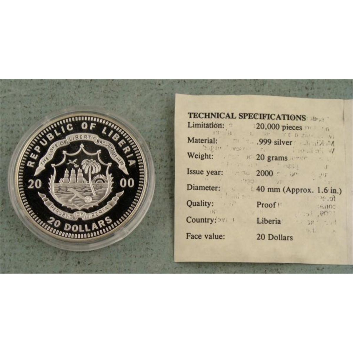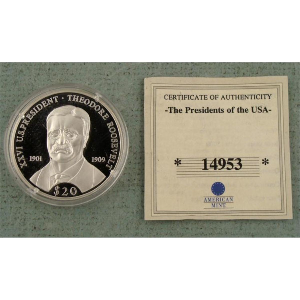 Here is a large 2000 Liberia .999 Silver, 20 gram commemorative coin. On one side is President Theodore Roosevelt (1901-09) and the other is the Republic of Liberia, with an island, ship, sunset, and airplane in the background. * * The diameter of the coin is 33 mm. It comes with a Certificate of Authenticity from American Mint and is in a protective case. *