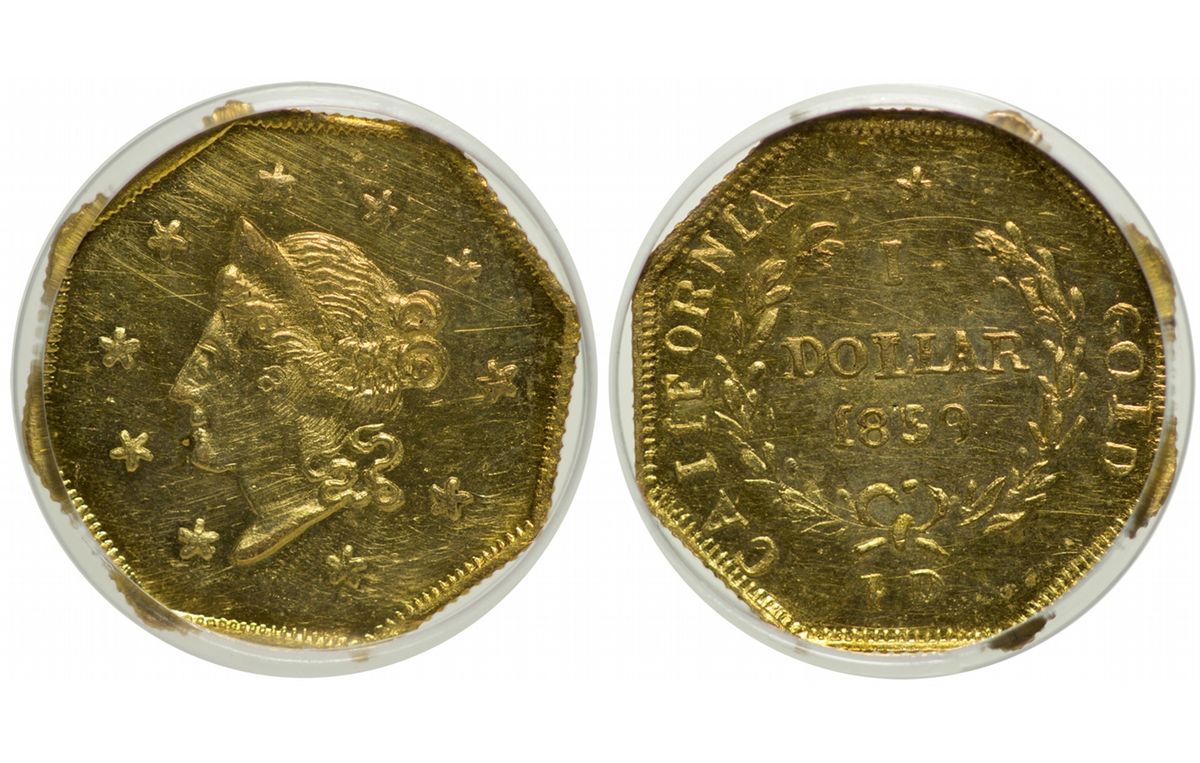 The only 1859-dated gold dollar of any type, issued by Frontier Deviercy. Extremely Rare; only 3 or 4 known, none reported since publication of Breen-Gillio. Plate Coin, second edition, Breen-Gillio, California Pioneer Fractional Gold. Prooflike Select Brilliant Uncirculated, die polish marks (not hairlines). "Finest Known by a Large Margin." PCGS MS-62 Plate Coin. Ex Bowers and Merena Jay Roe 9/14/2003, Lot 545, ex Jay Roe Collection, ex Superior Heifetz 10/1/1989, Lot 387, ex Jascha Heifetz, ex Elder Comstock-Gunther 1/26/1935, Lot 1103, ex Samuel W. Comstock. Serial# 90021564 Bergen-Istvan Collection HKA#63862