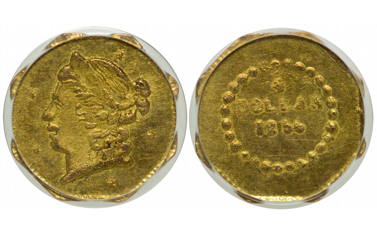 1856 Only 2 examples recorded in Breen-Gillio, none reported since; this is not the Jay Roe example, but might be No. 2 on the list, reholdered, because the grade is the same, or possibly a third example. Choice Brilliant Uncirculated, slightly warped. PCGS MS63. Second finest, only one finer. Serial# 10859487