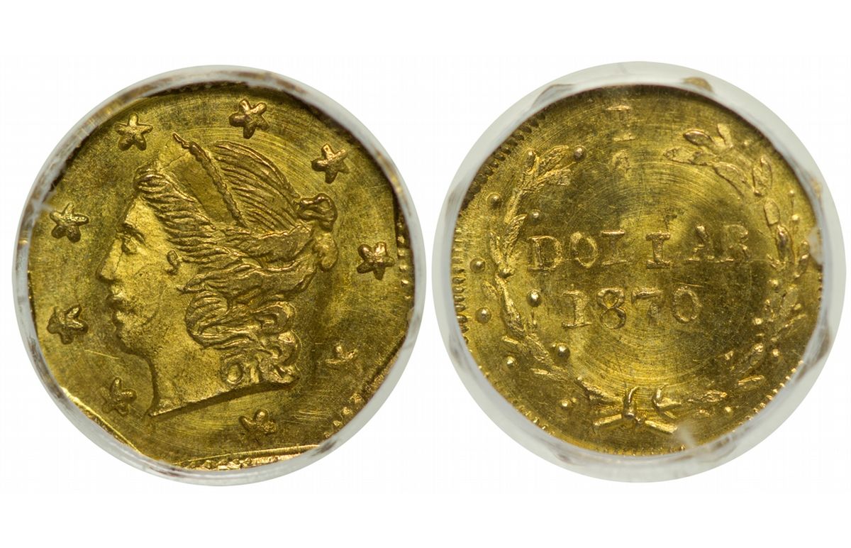 1870 Superb Gem Brilliant Uncirculated, frosty--an early strike from the dies. Tied for Finest Known NGC MS 67. One graded MS67 by PCGS. Serial# 2160727-001 Bergen-Istvan Collection HKA#63769