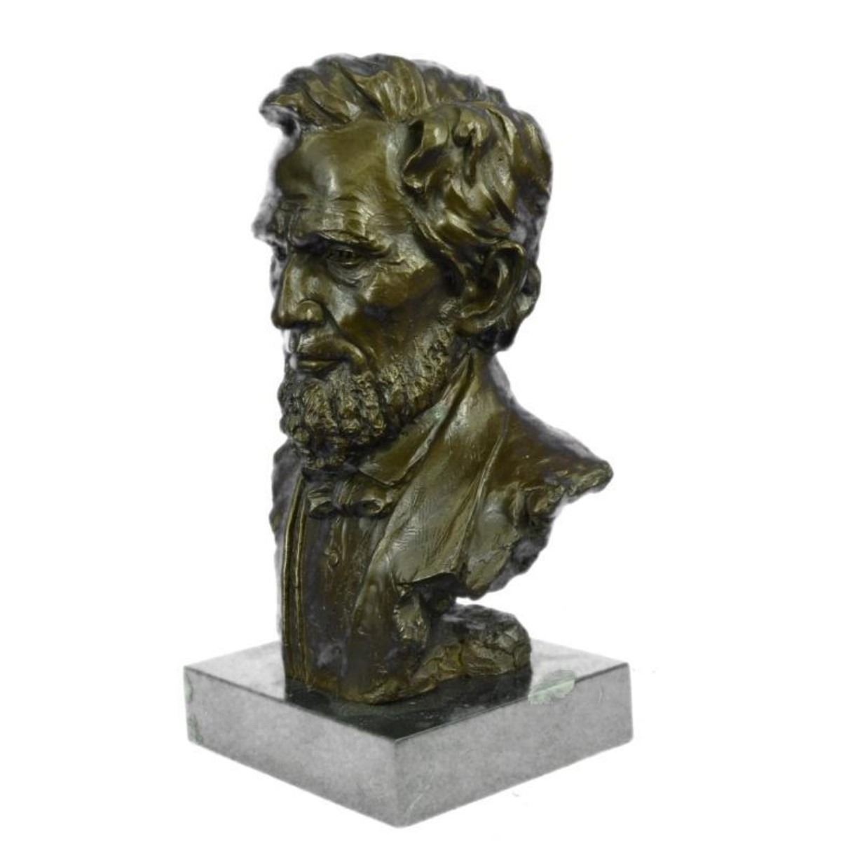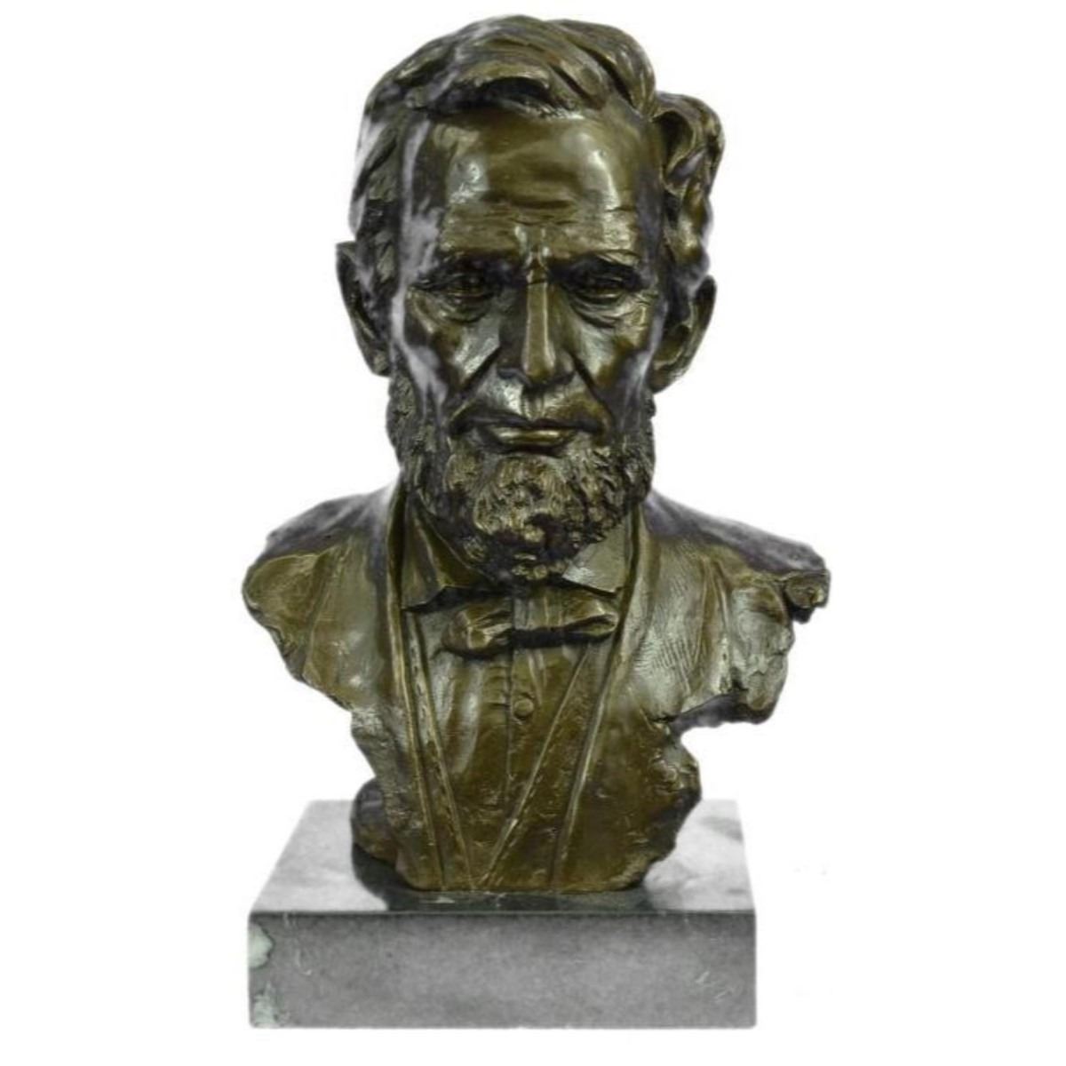 Large, limited edition, signed bust, sculpture of the 16th President of the United States, Abraham Lincoln. Lost wax casting method bronze, with brown patina, mounted on a marble base. Signed MAVCHI. 13" X 8".12lbs.