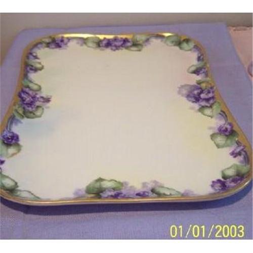 This is marked only "Limoges France" so I am not sure who the manufacturer is, but as you can see from the photos, it is a companion piece to the large hair receiver I have listed. This piece measures 11.5 inches long and 8.25 inches wide. It is decorated with handpainted purple violets, green leaves, and gold trim. There is a small round indentation, about the size of a pencil eraser, on the back where a very thin layer of porcelain appears to be missing, but aside from that, it is in excellent undamaged condition.