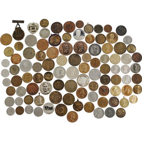 <B>Large Lincoln Coin and Medal Grouping</B></I> A large dealer's hoard of numismatica and exonumia, consisting of approximately 100 pieces, mostly 1.25" and smaller including some Lincoln centennial pieces as well as some fun advertising pieces. Some bear small numbered stickers from an older collection. Condition varies as expected and contains duplicates. Should be viewed.<BR><BR><b>Shipping:</b> Miscellaneous Collectibles, Smal (<a target="_blank" href="http://www.heritageauctions.com/common/shipping.php">view shipping information</a>)