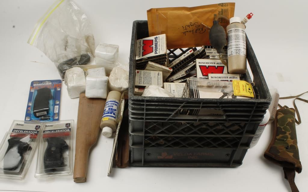 Includes a gun rack, Hogue grips, Pachmyer grips, calipers, case cleaner, brass bright, IMR 4831 powder, cleaning patches, assorted primers for shotguns and small pistols, .41 brass, assorted bullets, and more.