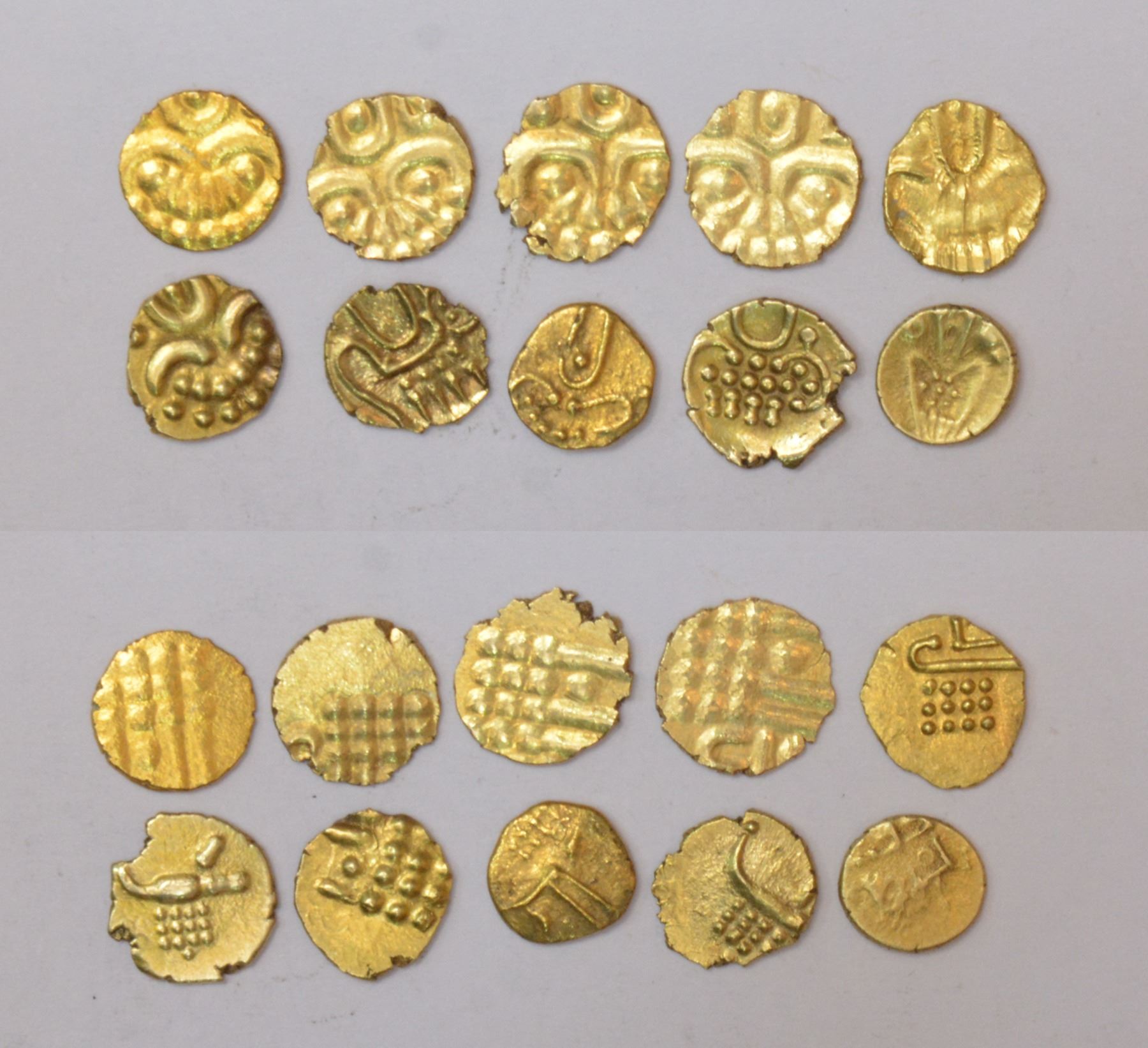 A group of 10 Veera Raya gold fanams, includes kali and crocodile type, various weights and symbols. (10 coins)