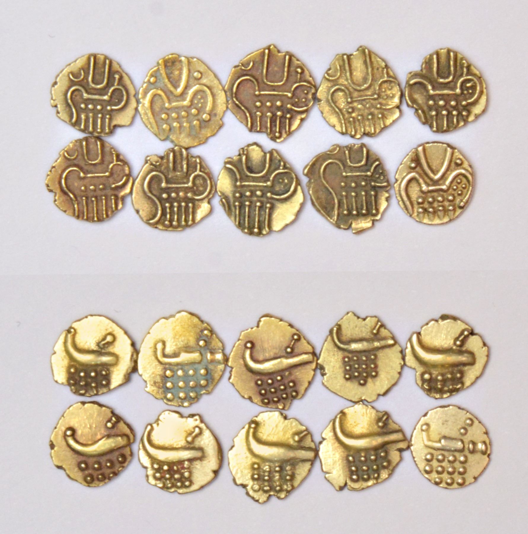 A group of 10 gold Veera Raya fanam, with figure of goddess Kali on obverse and Lazy J on reverse. (10 coins)