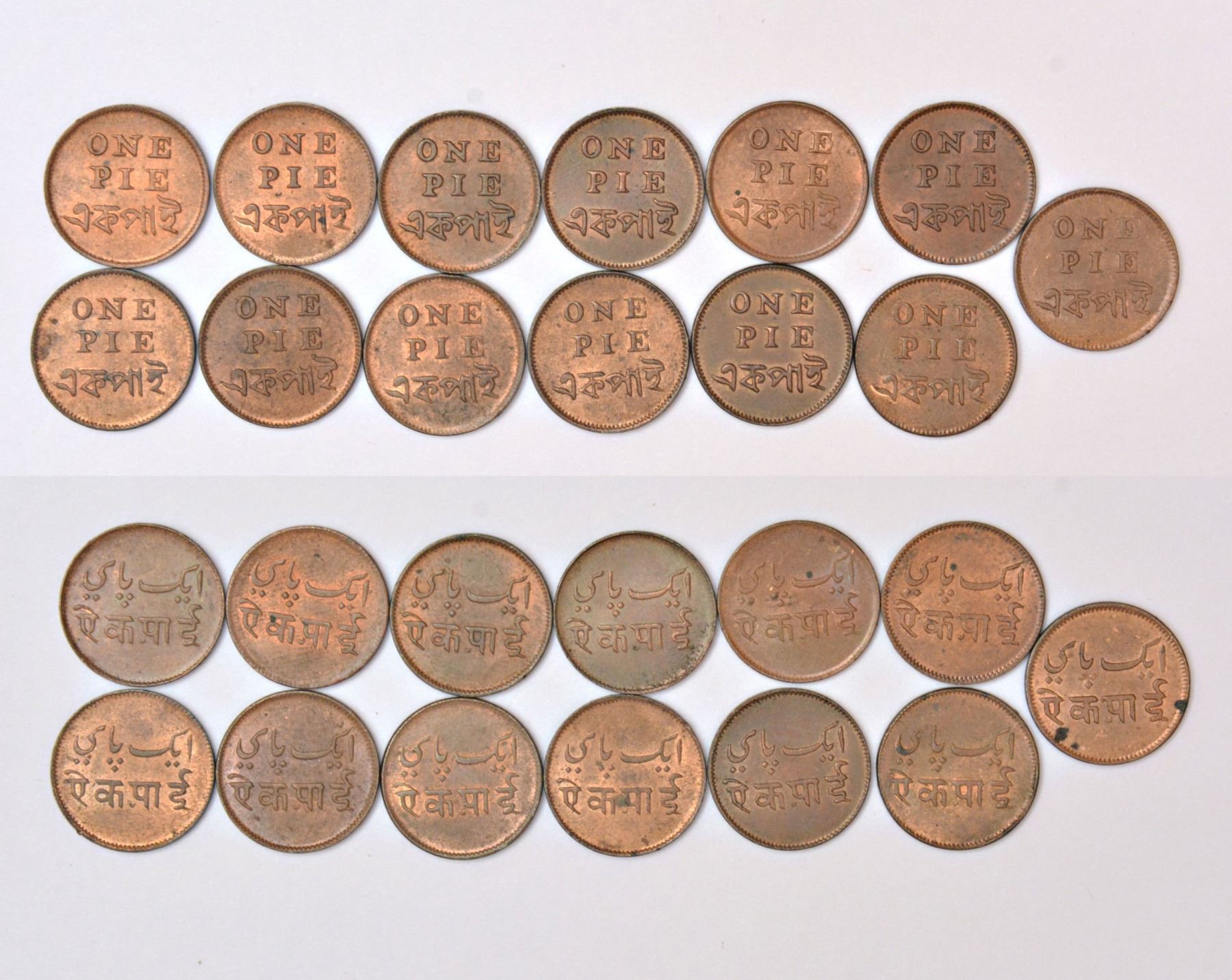 A group of 13 Bengal presidency copper pie. Obv: Value in English and Bengali. Rev: Value in Persian and Devanagari. (13 coins)