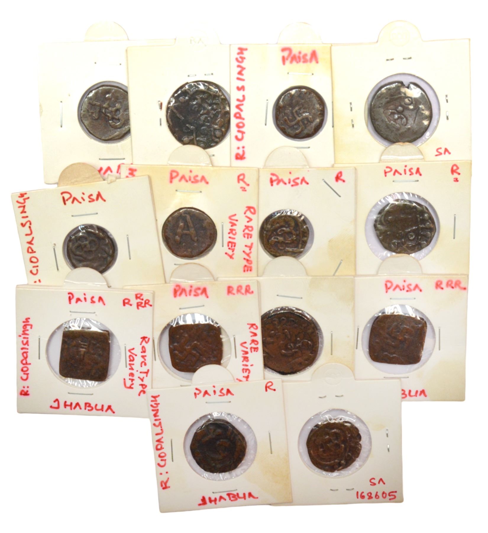 A group of 14 Jhabua state copper paisa, Gopal Singh, various shapes, marks and types. (14 coins)