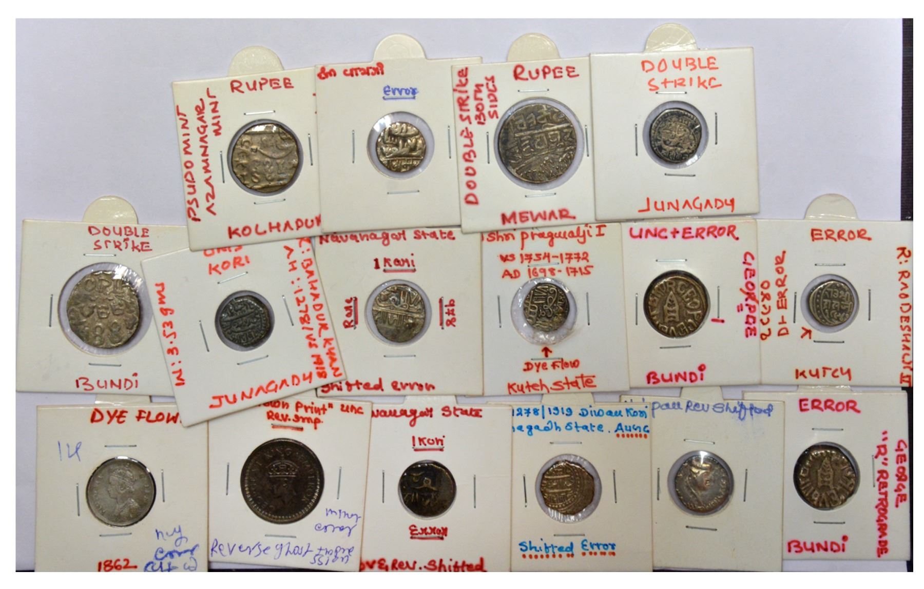 A group of 16 error silver coins, includes errors like Double struck, Die-shift, Ghost image, etc. Some coins may be normal or damaged. (16 coins)