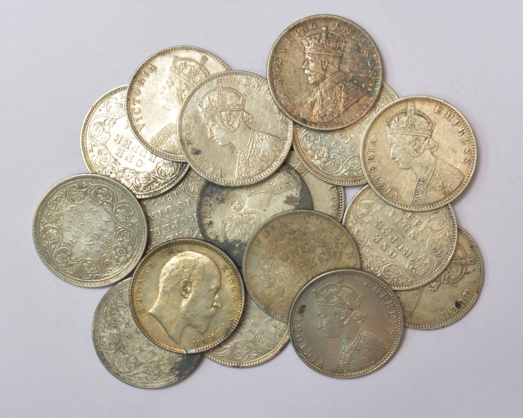 A group of 17 British India silver rupee, includes 15x Victoria, 1x Edward VII and 1x George V, various dates and types. (17 coins)