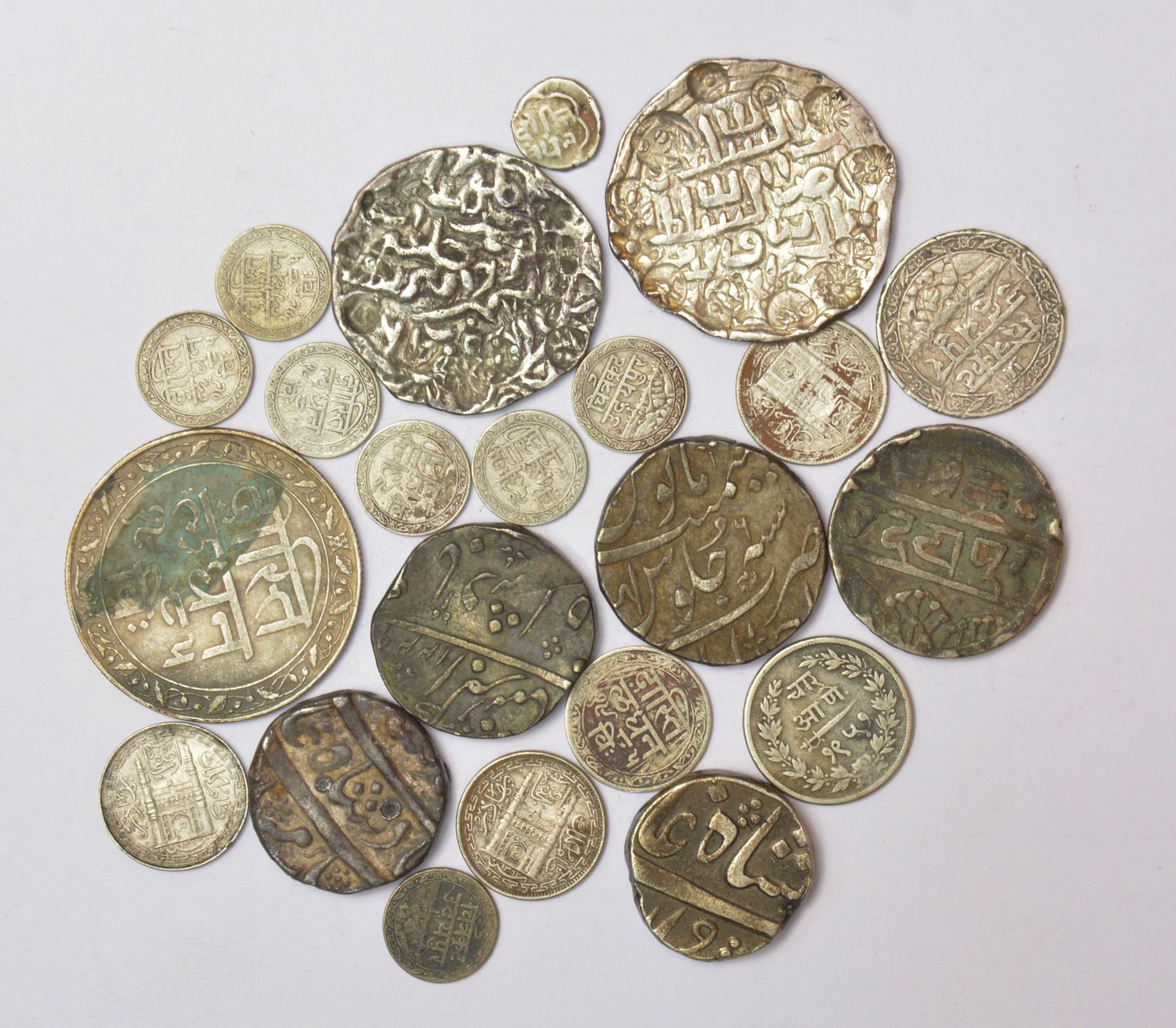 A group of 22 silver coins, rupee to 1/16 rupee denomination, includes Sultanate, Baroda, Hyderabad, Mewar-Udaipur, various rulers, denominations and types. (22 coins)