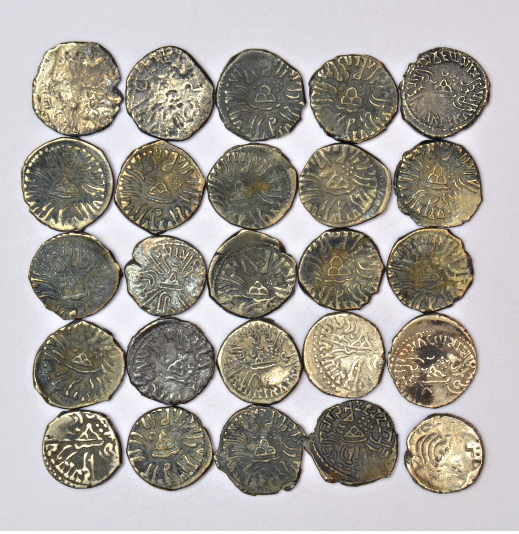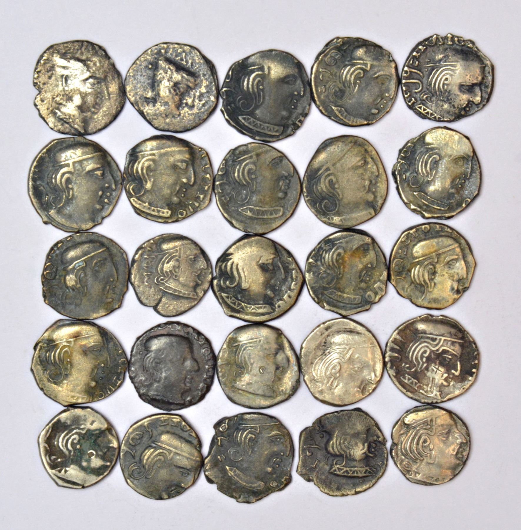 A group of 25 Western Kshatrapa silver dracham, includes various ruler like Chastana, Rudradaman son of Jayadaman, Rudrasena I, Vijayasena, Rudrasena II, Bhartrdaman, many dated. (25 coins)