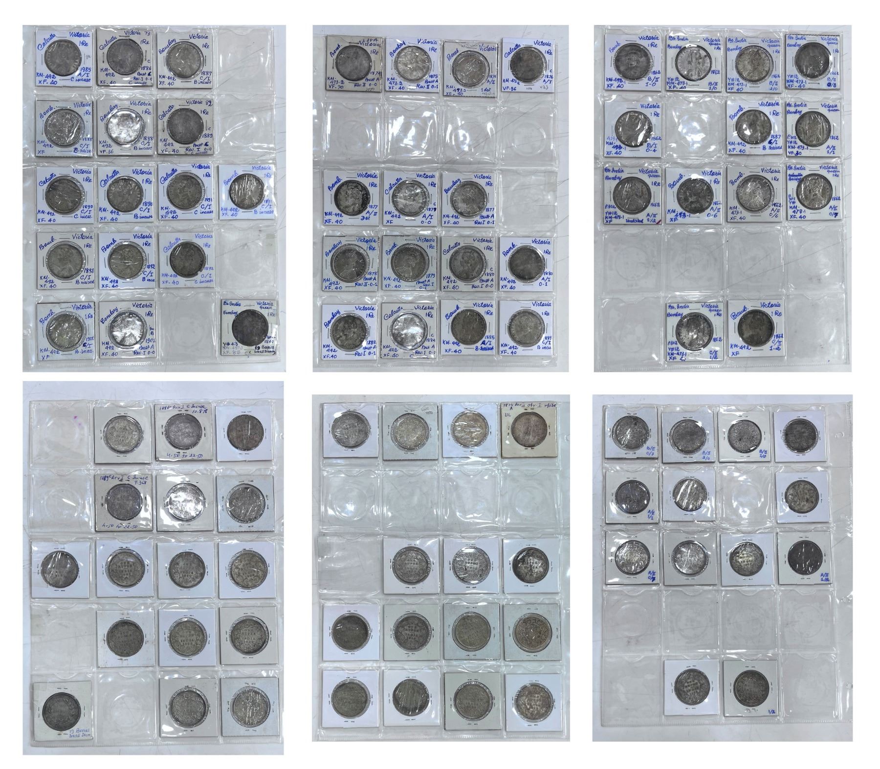 A group of 44 Victoria silver rupee, includes Queen and Empress, Bombay and Calcutta mints, various dates and types, most of the variety is described on the folder. (44 coins)