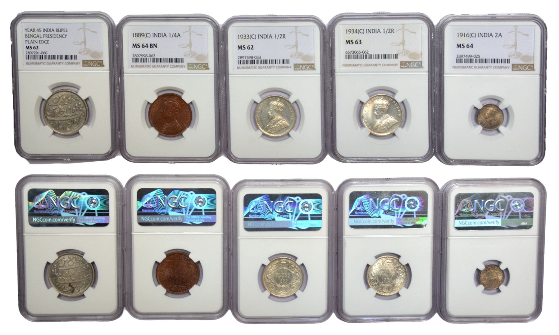A group of 5 NGC graded coins, includes 4x silver coins of Bengal Presidency and George V and 1x copper ¼ anna of Victoria, various denominations, dates and types. (5 coins)
