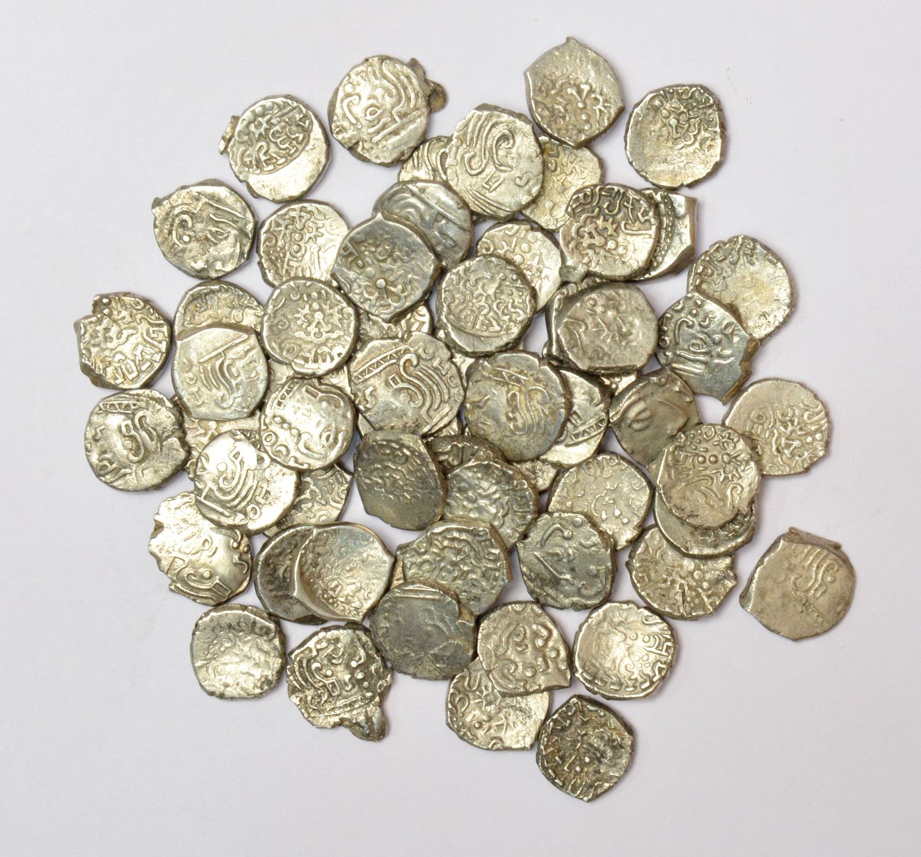 A group of 60 Ancient Gupta silver coins, mostly Kumargupta, various weights and types. (60 coins)