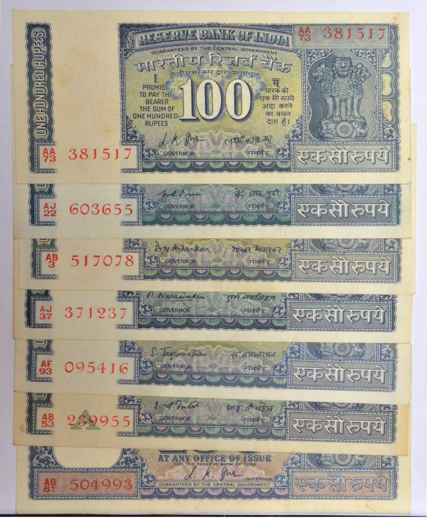 A group of 7 Republic of India notes, 100 rupees, signed by various Governors and types. (7 notes)
