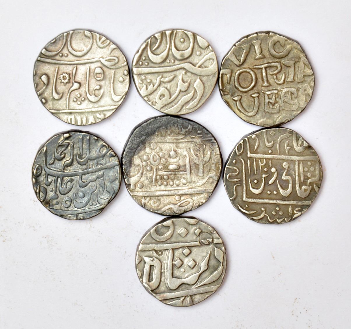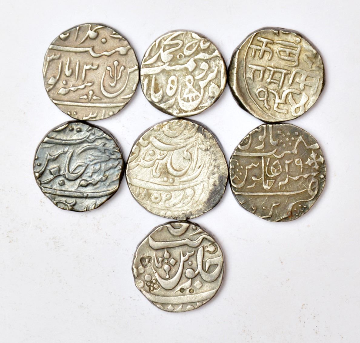 A group of 7 silver rupee coins, includes Awadh, Bhopal, Bundi, Bikanir, Narwar and Maratha Poona mint. (7 coins)
