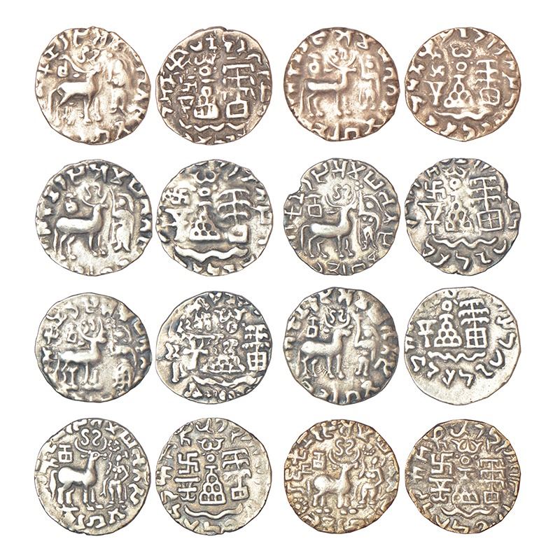 A group of 8 Kuninda silver drachm of Amoghabhuti, various types and weights. Obv: Goddess holding lotus standing facing, a deer to her left, Shrivatsa between horns and altar above rump; Brahmi legend around. Rev: Composite symbol of six arched hill, wavy line, Nandipada, Swastika, triangle-headed standard -Shrivatsa and tree-in-railing; Kharoshthi legend around. (8 coins)