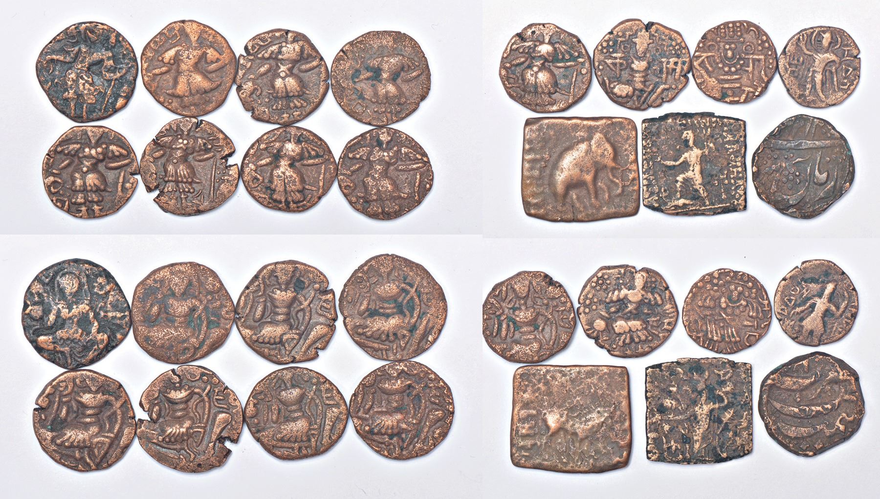 A mixed lot of fifteen copper coins showcaing a selection of coins usually found in Kashmir. It consists of two coins of Indo-Scythian king Maues (c.80BC) , one coin of Kushan king Kanishka (c.127-150AD) with 'Mao' on reverse, nine coins of the Hunnic king Toramana (c.6th century AD) and two coins of the Hindu kings of Kashmir (Kalashadeva and Jagadeva, c.12th - 13th centuries AD). (15 coins)