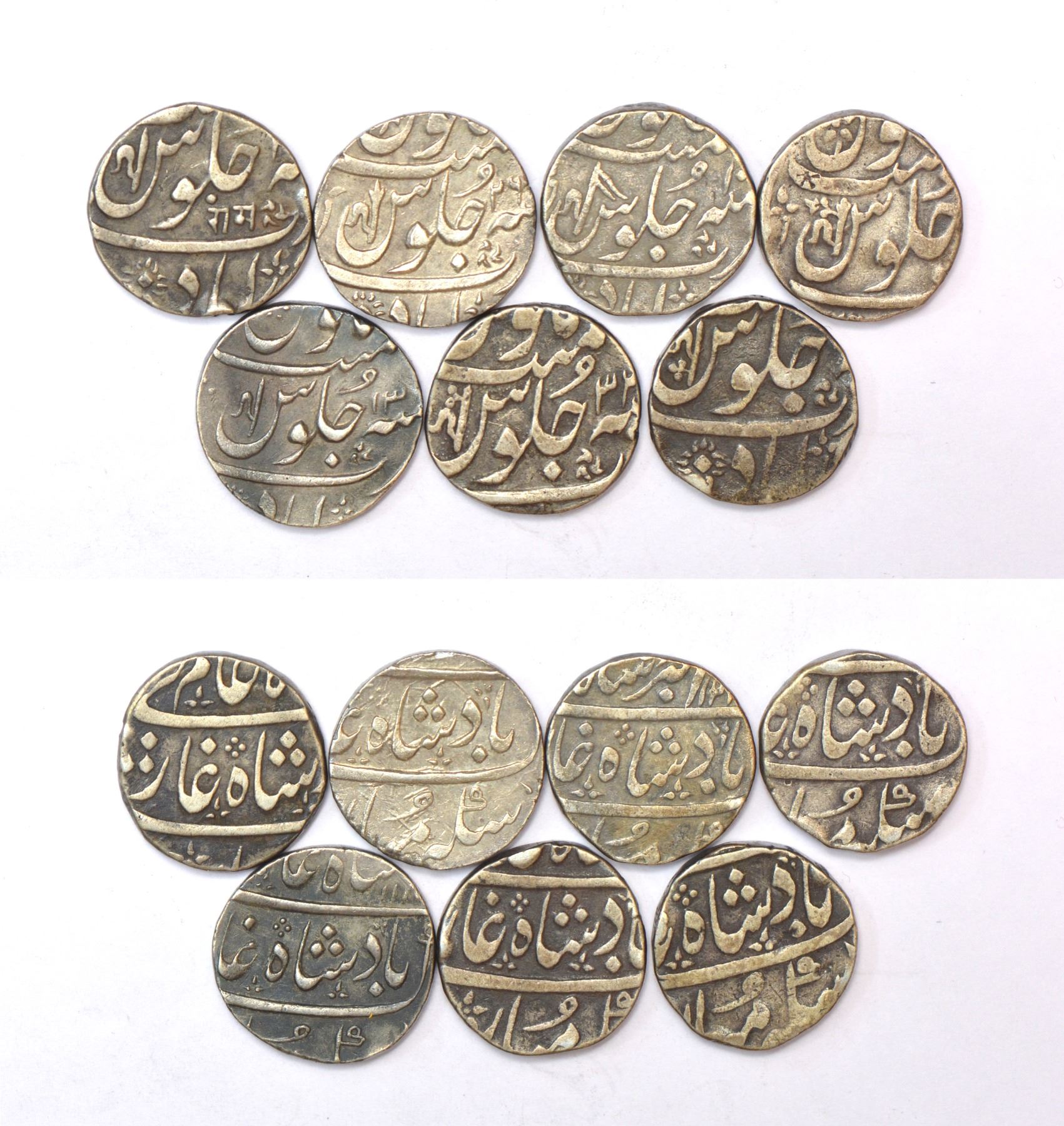 Maratha Confederacy, silver rupee (7), Ahmadabad mint with devanagri Ram and vsrious types of Ankusi mintmark. (7 coins)