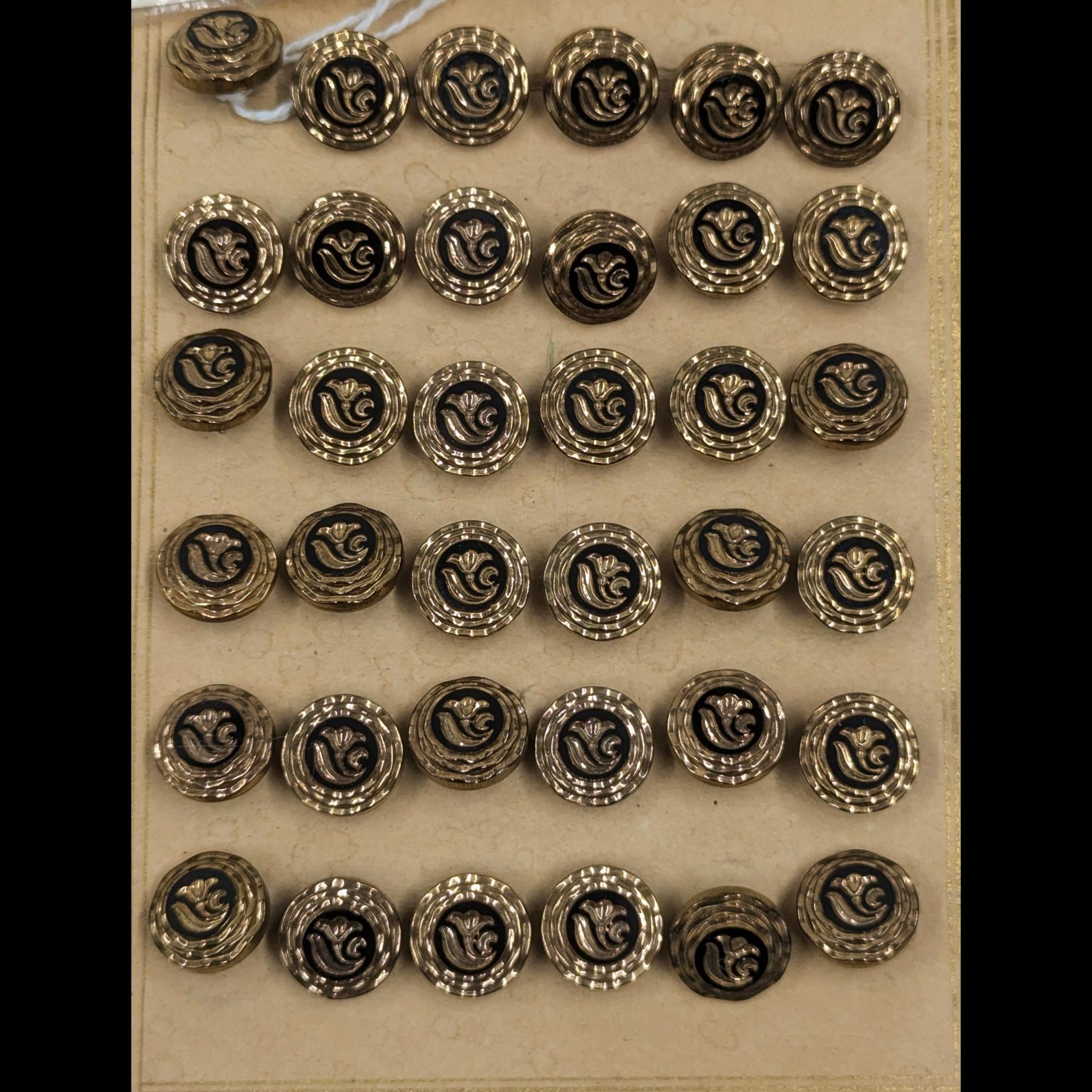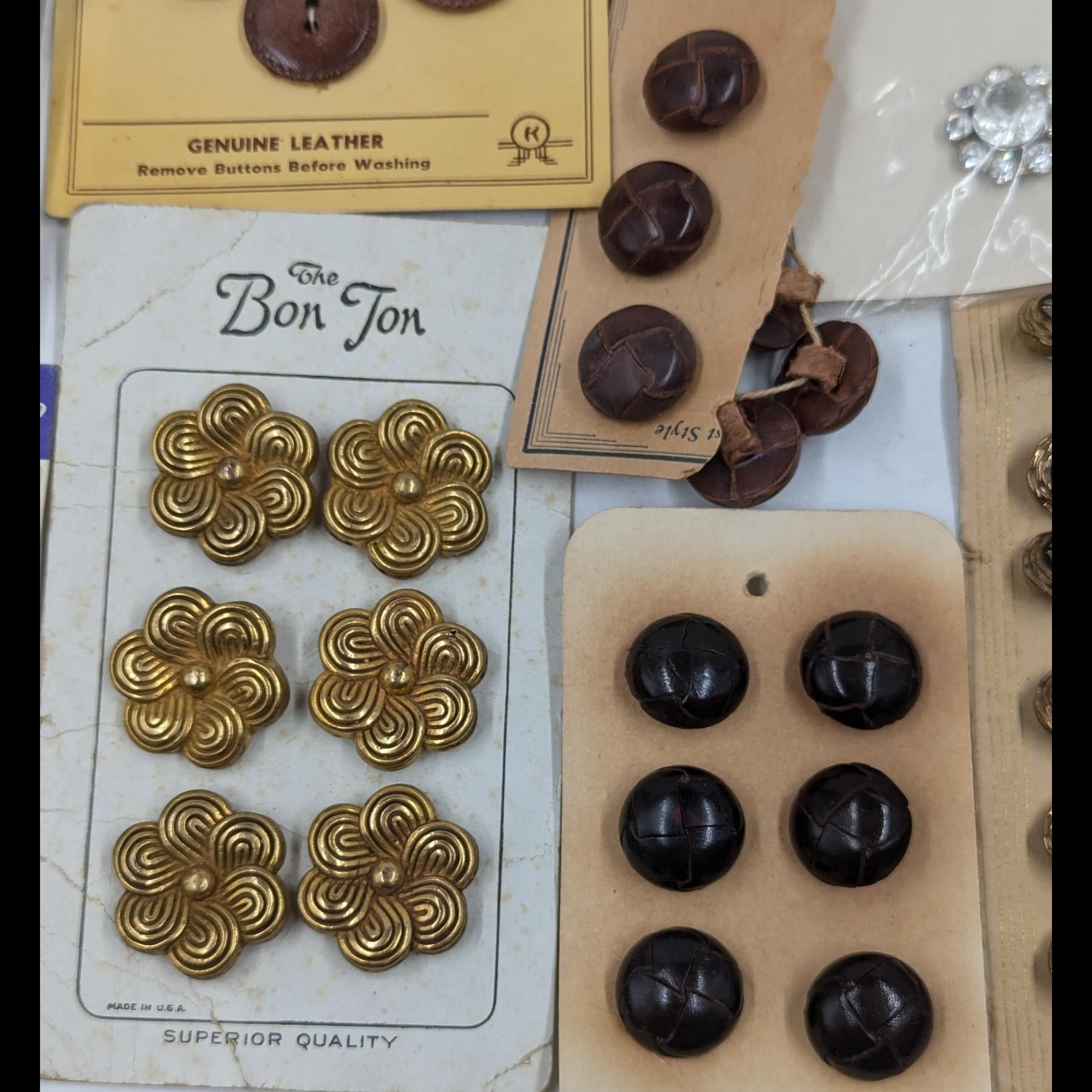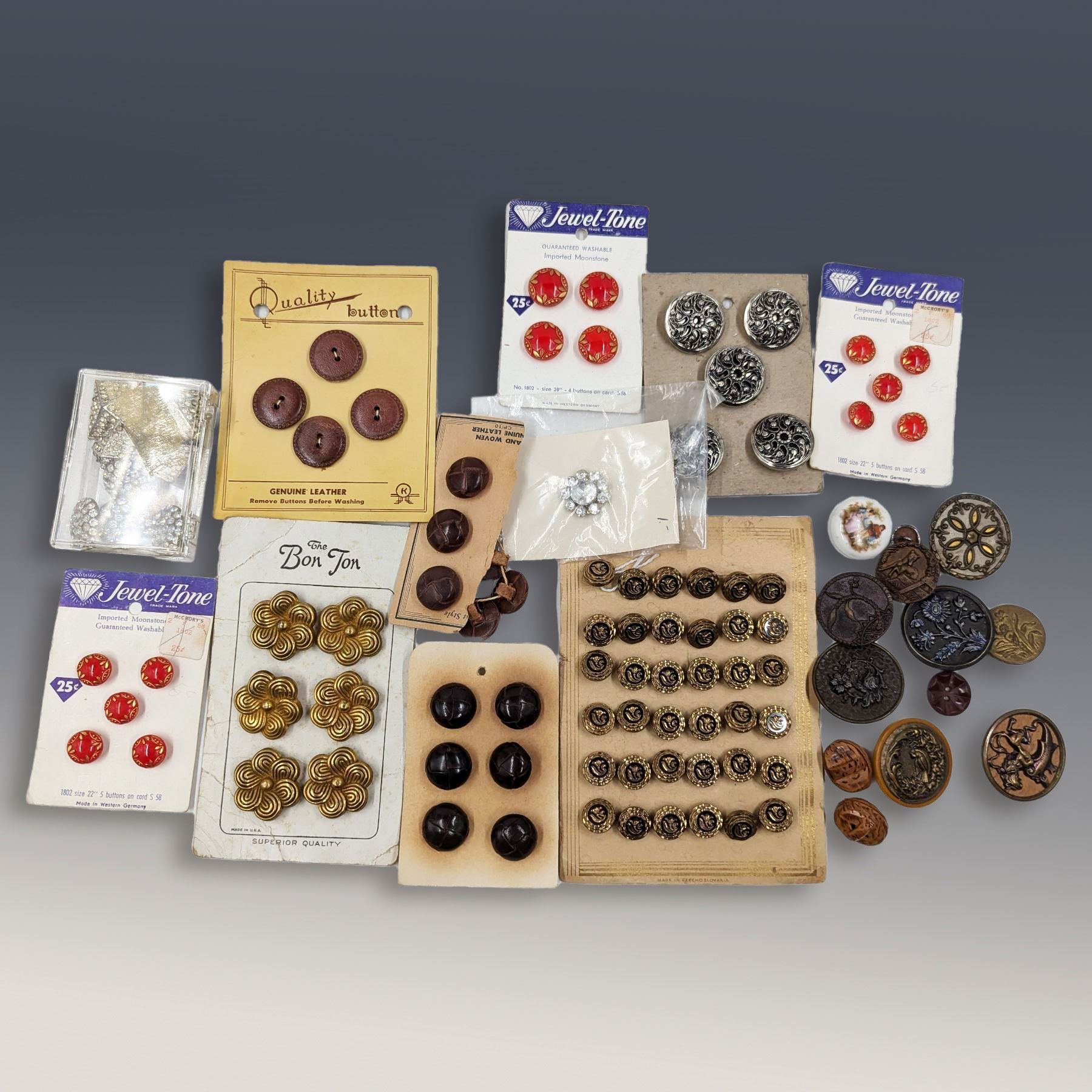 Large Lot Of Vintage Buttons Of Various Styles And Designs, Approx. 150 Items. This lot consists of 8 carded button sleeves from a variety of manufacturers There are about 75 black glass inlaid brass buttons and some rhinestone buttons.
