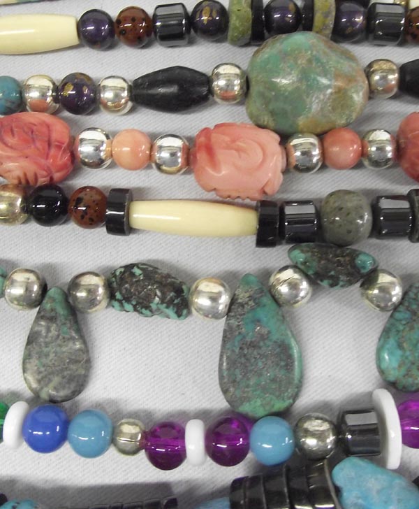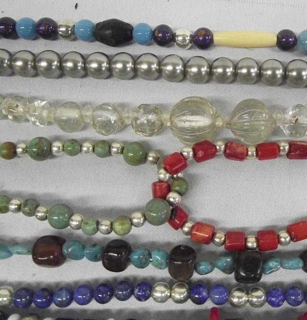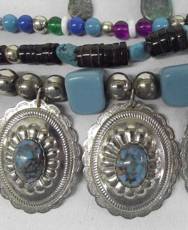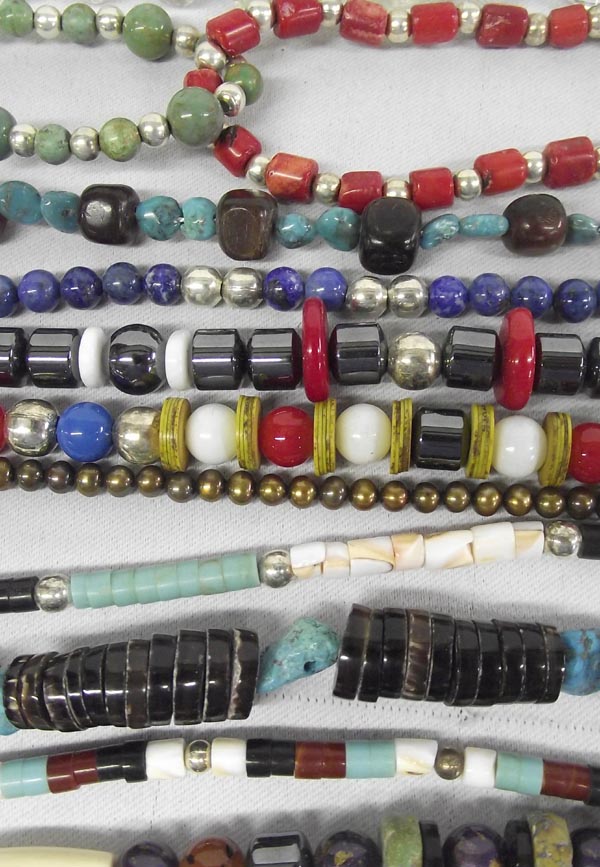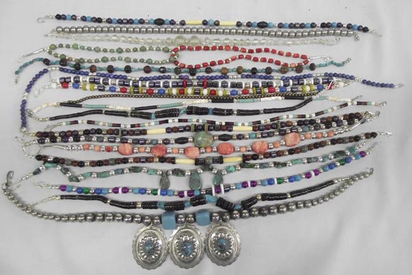 Large lot Native American Pueblo necklaces. Various lengths, some with turquoise, coral, conchos, etc. Buyers Pay Actual Shipping and Handling Charges(see terms and conditions for more information).