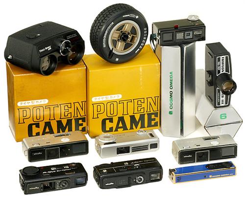 Large Lot: Subminiature Cameras 1) Minox, Gießen. "Minox C", no. 2335039. - 2) Miyagi Sanken Co. "Prince 16A", 1964, size 14 x 16 mm, fixed focus lens, shutter I+B. - 3-7) 2 x Minolta 16P, 1960 (different models), size 10 x 14 mm, Rokkor 3,5/25 mm, shutter 1/100 sec., Minolta-16 MG", 1966, Rokkor 2,8/20 mm, shutter 1/30-1/250. "Minolta 16 MG-S", 1970, Rokkor 2,8/23 mm, not working. "Minolta 16 QT", 1972, Rokkor 3,5/23 mm, shutter 1/30 and 1/250. - 8) Sedic Co. "Tele Spot 110", 1979. - 9) Japan "Triplon 110-70T", c. 1975. - 10-12) 3 x Keio "Tyre Camera", 1981, with original boxes. - 13-14) 2 x Asanuma Trading "Cosmo Omega", c. 1985, nice camera for Minox film, with original boxes.<Br>
