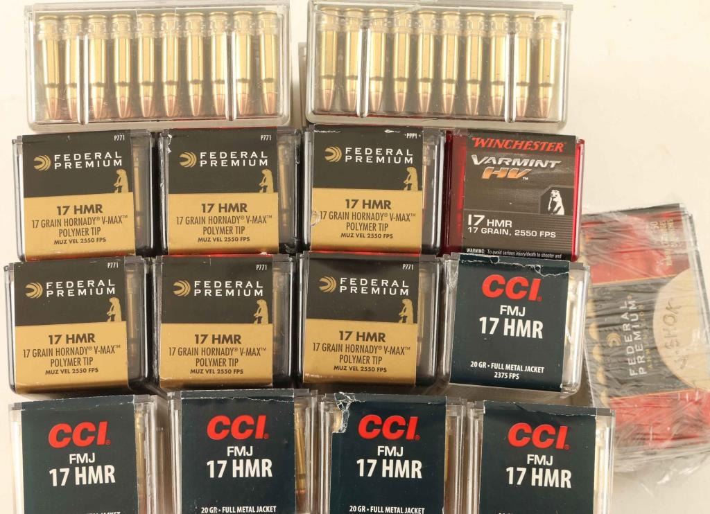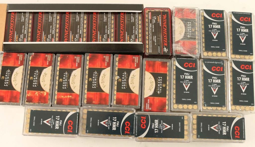 Small ammo can with 450 rounds of CCI 17 HMR 20 grain FMJ, 350 rounds of Federal Premium 17 HMR 17 grain Hornady V-Max Polymer Tip ammo and 300 rounds of Winchester Polymer Tip V-Max 17 grain Varmint 17 HMR. (Total of 1100 rounds.)