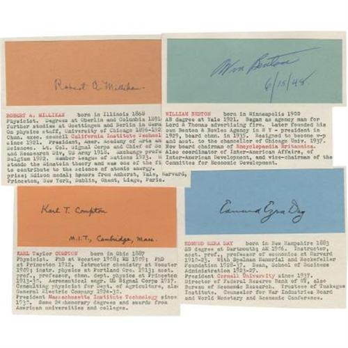 <B>Large Lot of 20th Century College President Signatures</B></I> all on cards, about 5.5 x 2, mounted on stiff paper stock with typed biographical sketches. Ivy League schools are well represented by this lot of administrator signatures including <B>Charles Seynour,</B></I> president of Yale University 1937-1951, <B>James Bryand Conant,</B></I> president of Harvard University 1933-1953, <B>Robert I. Gannon,</B></I> president of Fordham University 1936-1949, <B>Robert M. Hutchins,</B></I> president of the University of Chicago 1929-1945, <B>Karl T. Compton,</B></I> president of Massachusetts Institute of Technology 1930-1948, <B>Edmund Ezra Day,</B></I> president of Cornell University 1937-1949, and American experimental physicist <B>Robert A. Millikan</B></I> (1868-1953) and <B>William Benton</B></I> (1900-1973), publisher of the <I>Encyclopedia Britannica.</B></I> Fine. <BR><BR><b>Shipping:</b> Flat Material, Small (<a target="_blank" href="http://www.heritageauctions.com/common/shipping.php">view shipping information</a>)