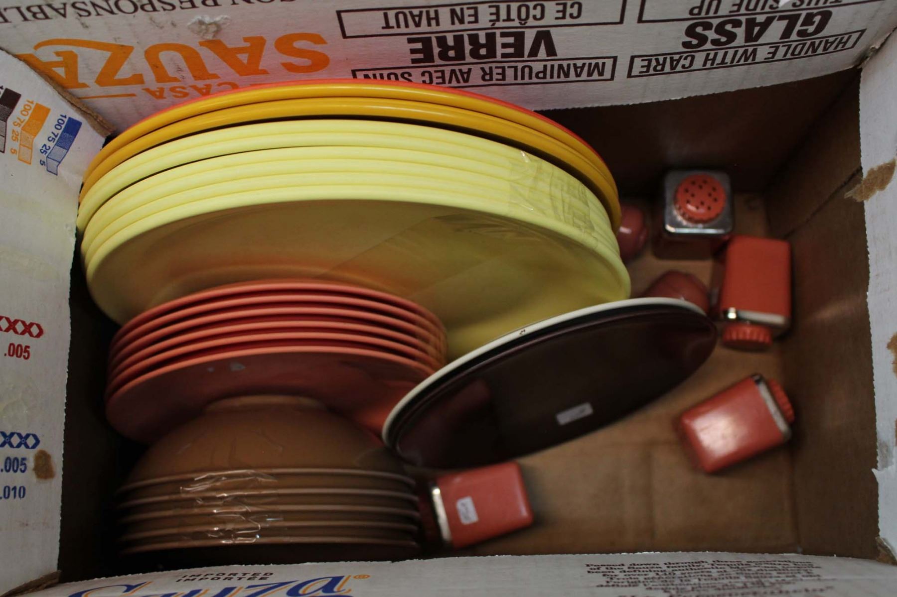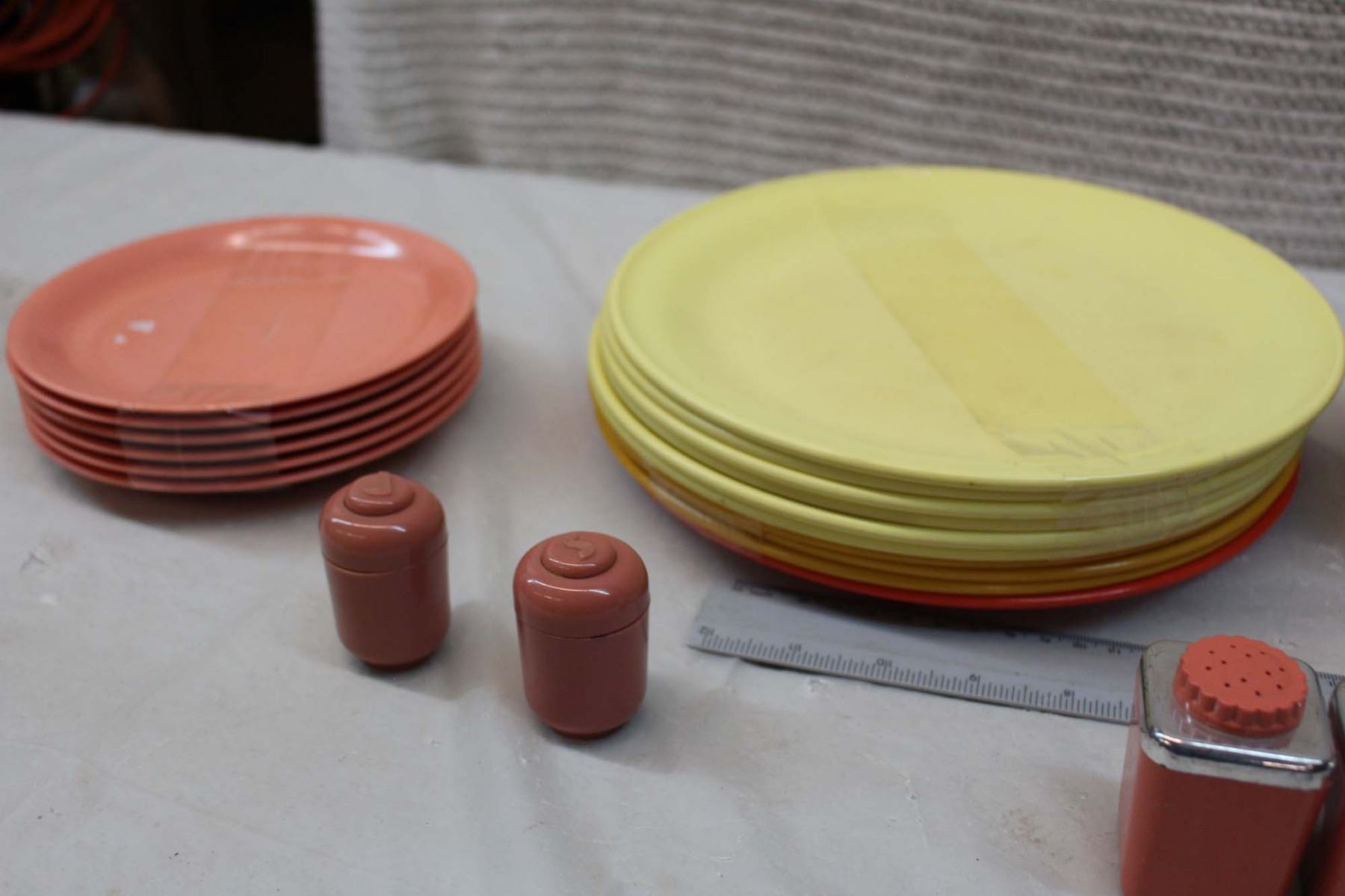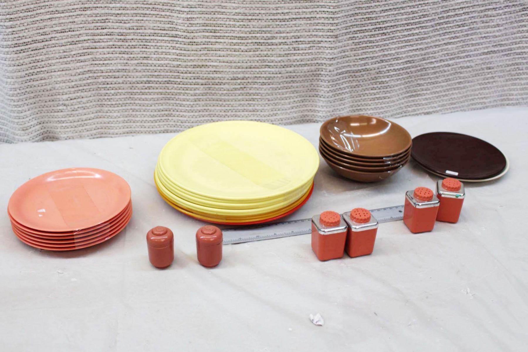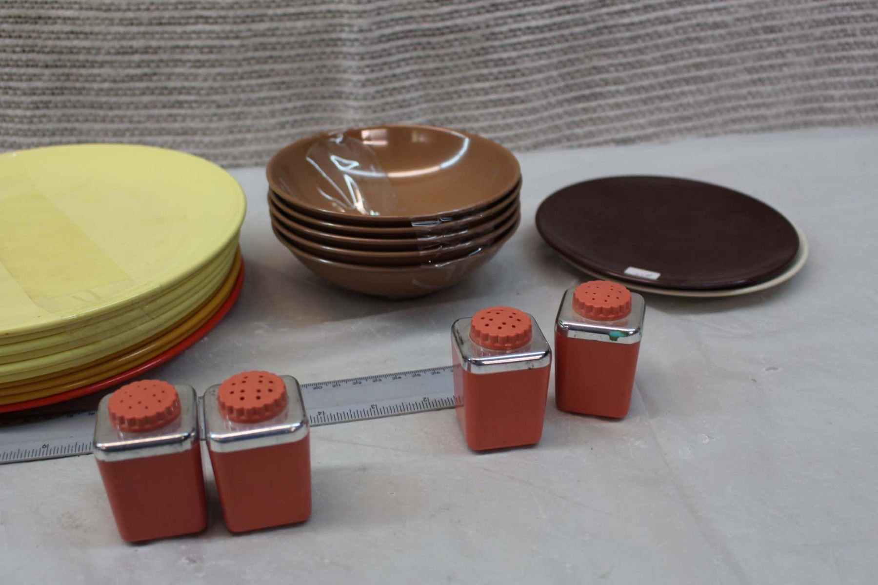 Large Lot of Assorted Melamine Dinner Ware (Dinner Plates, Dessert Plates, Cups, Bowls, Salt & Pepper Sets)