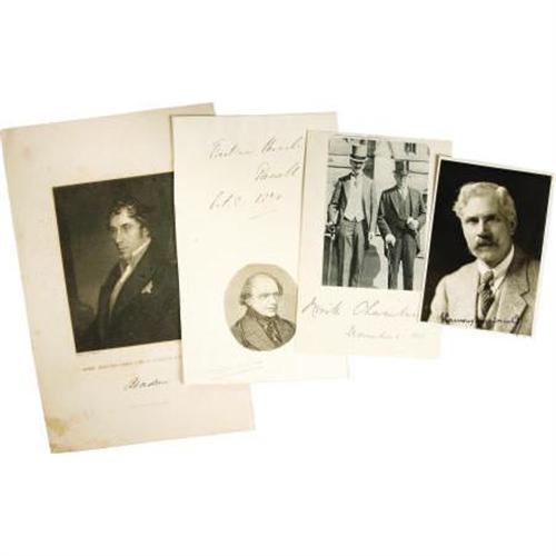 including: Sidney Godolphin, 1st Earl of Godolphin; Charles Montagu, 1st Earl of Halifax; Robert Harley, 1st Earl of Oxford and Earl Mortimer; Sir Robert Walpole; Henry Pelham; Thomas Pelham-Holles, Duke of Newcastle; John Stuart, Earl of Bute; George Grenville; William Pitt the Elder, Earl of Chatham; Frederick North, Lord North; Charles Watson-Wentworth, Marquess of Rockingham; William FitzMaurice, Earl of Shelburne; William Pitt, the Younger; Spencer Perceval; Robert Jenkinson, Earl of Liverpool; George Canning; Frederick Robinson, Viscount Goderich; Arthur Wellesley, Duke of Wellington; Charles Grey, Earl Grey; William Lamb, Viscount Melbourne; Sir Robert Peel; Lord John Russell; Edward Stanley, Earl of Derby; George Hamilton-Gordon, Earl of Aberdeen; Henry John Temple, Viscount of Palmerston; Benjamin Disraeli; William Ewart Gladstone; Henry Campbell-Bannerman; Herbert H. Asquith; David Lloyd George; Andrew Bonar Law; Stanley Baldwin; James Ramsay MacDonald; Neville Chamberlain; Clement Attlee; Sir Anthony Eden; Harold Macmillan; Sir Alec Douglas-Home; Harold Wilson; Edward Heath; James Callaghan; Margaret Thatcher, and others. Various sizes and forms. Several duplications. All near fine or better.<BR><BR><BR><b>Shipping:</b> Flat Material, Small (<a target="_blank" href="http://www.heritageauctions.com/common/shipping.php">view shipping information</a>)