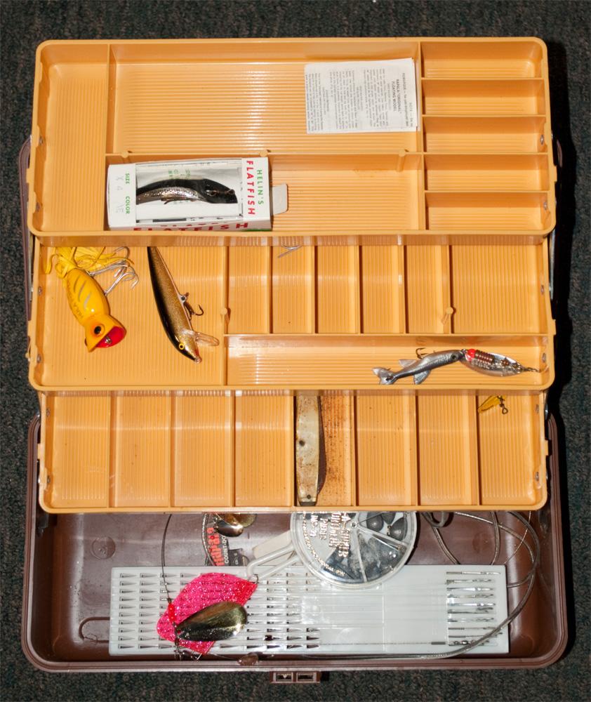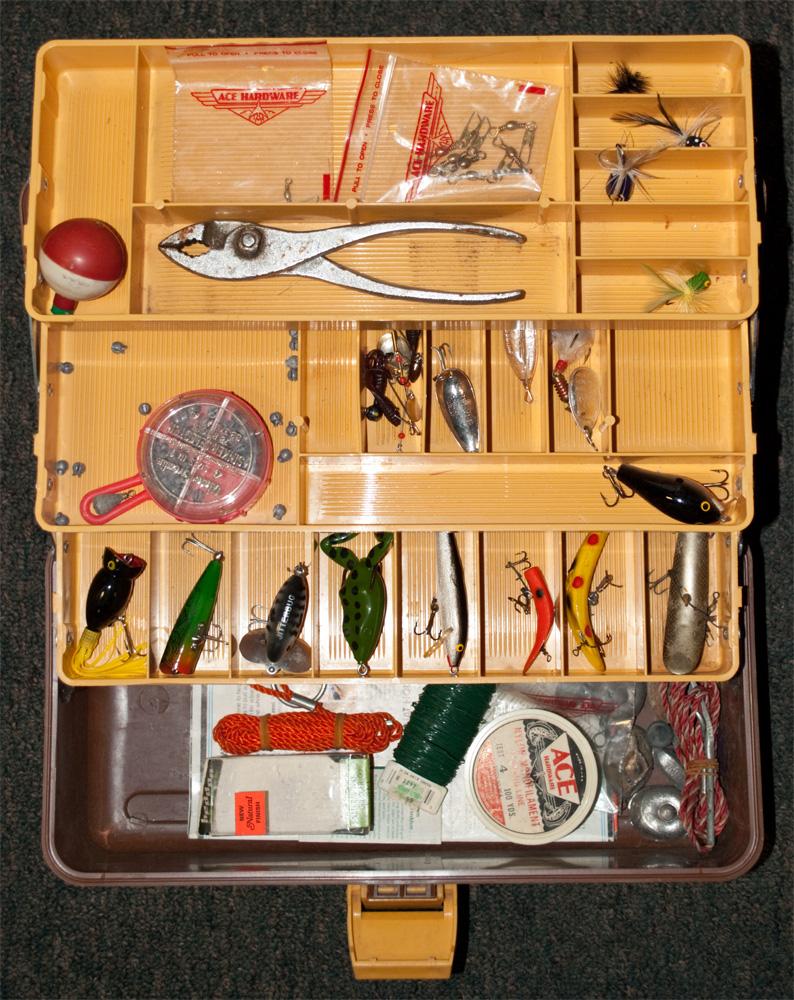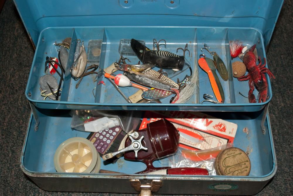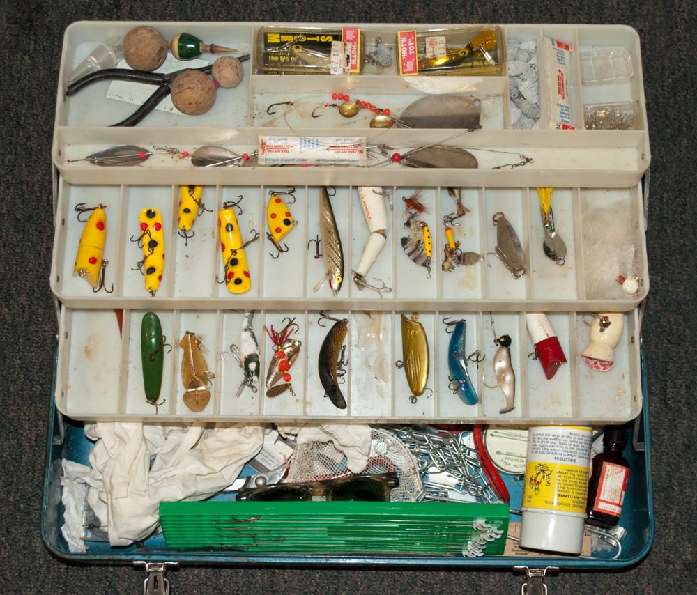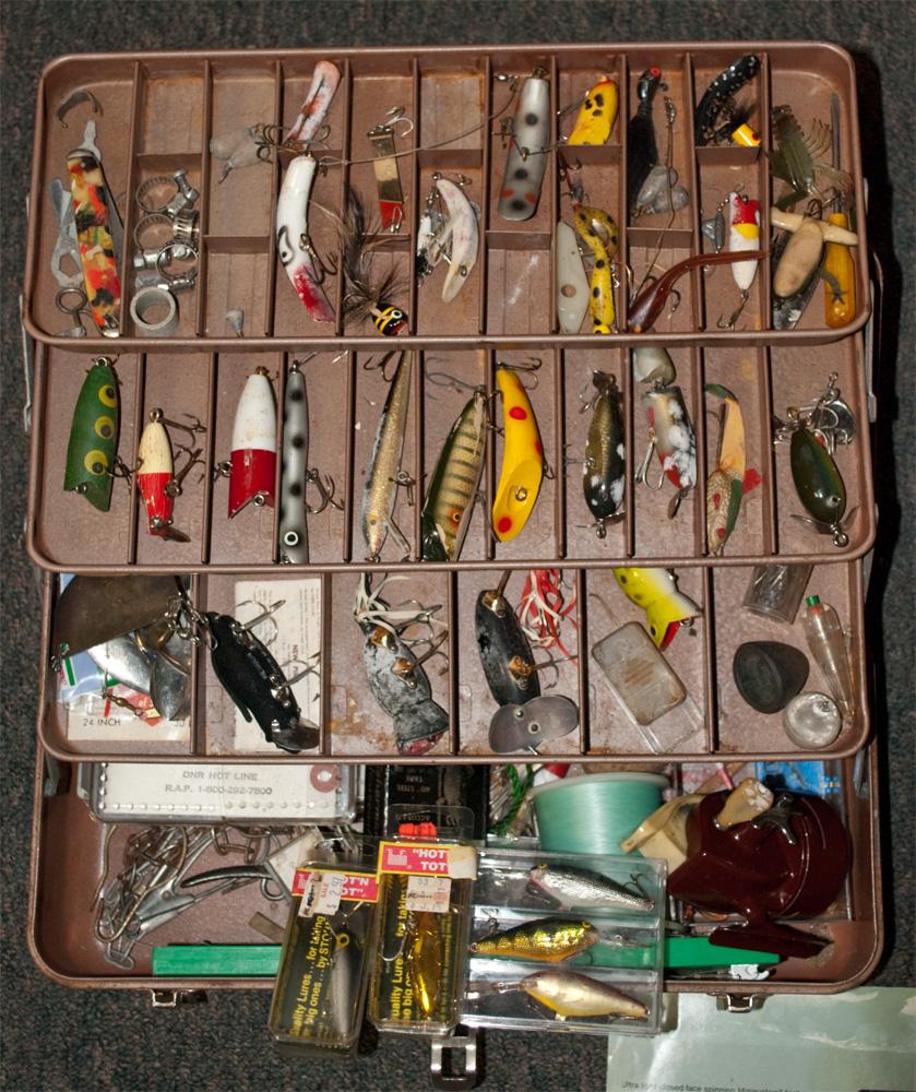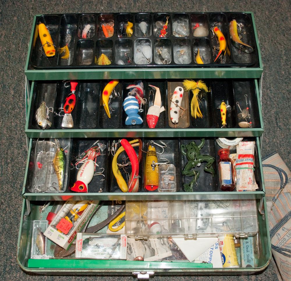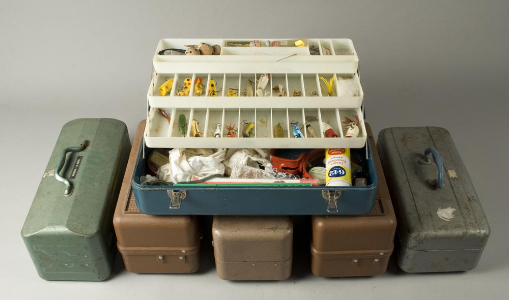 Contained in six tackle boxes, includes numerous lures, hooks, bobbers, pliers, flies, and much more. Good condition on most.
