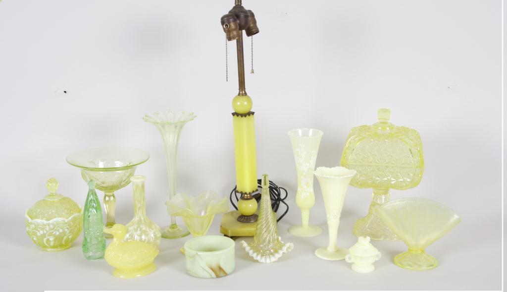 Large Lot of Green Vaseline Glass Includes vases, candy dishes, bowls, cups, candleholders and many more glass items. Also included is a lime green glass lamp base.Includes vases, candy dishes, bowls, cups, candleholders and many more glass items. Also included is a lime green glass lamp base.
