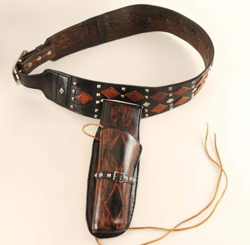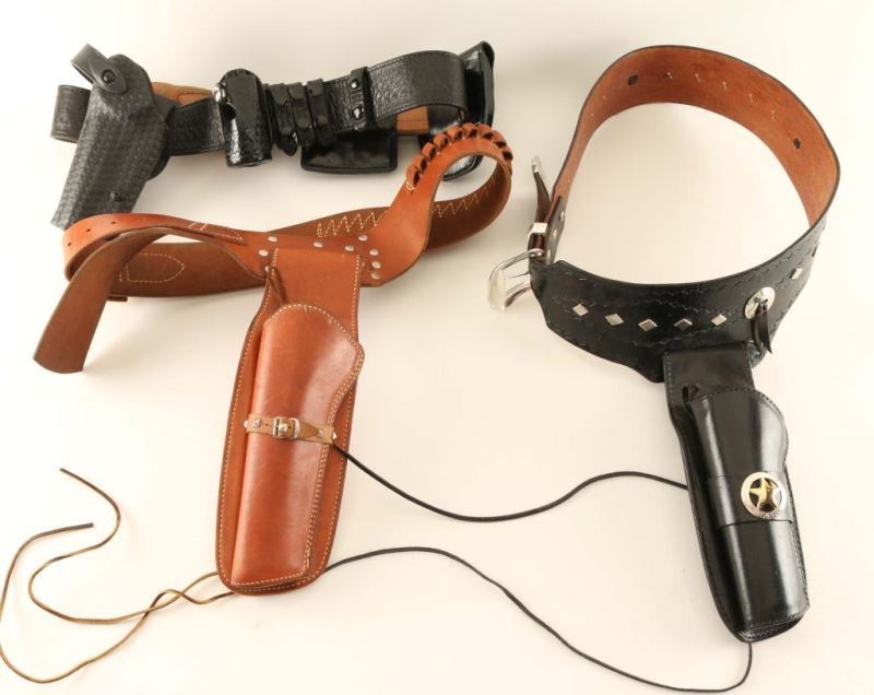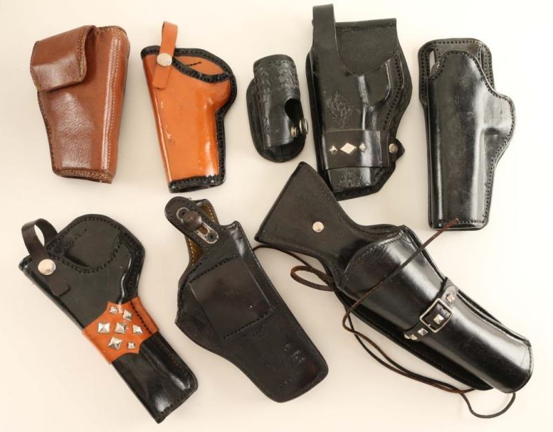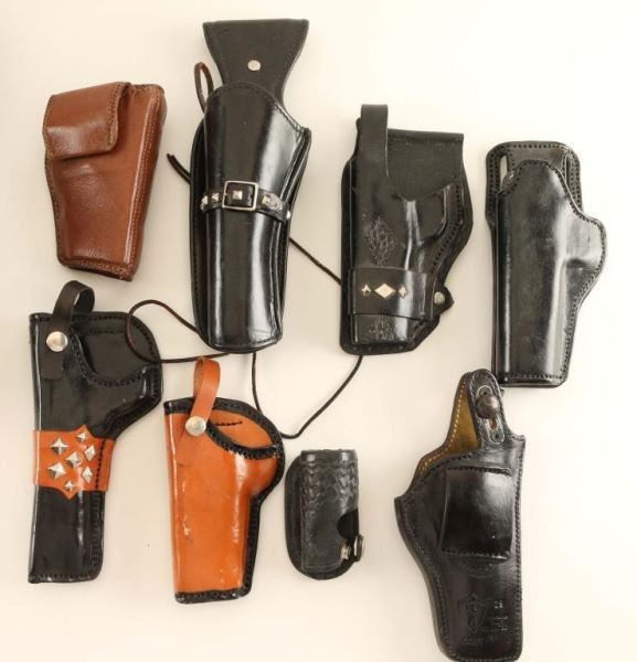 Including single holster rig two tone black leather with diamonds, Hunter single holster rig with diamond spotted design and star concho, smooth brown leather single holster rig by Hunter, black leather duty belt, and six other leather holsters.