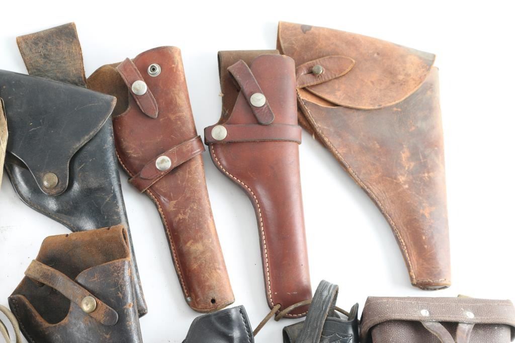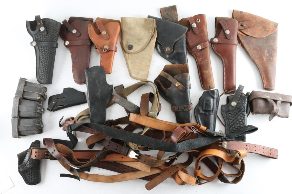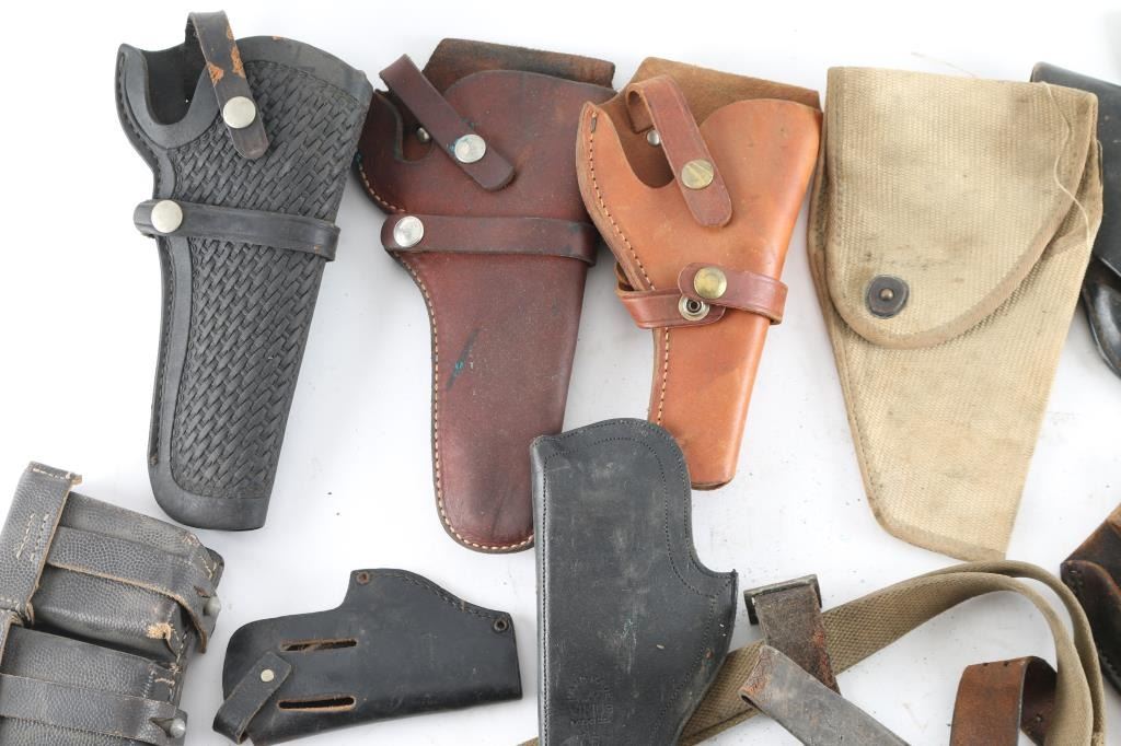 includes commercial and military issue items, slings and holsters, some cotton web slings. Over 10 pounds. Mostly good condition.