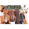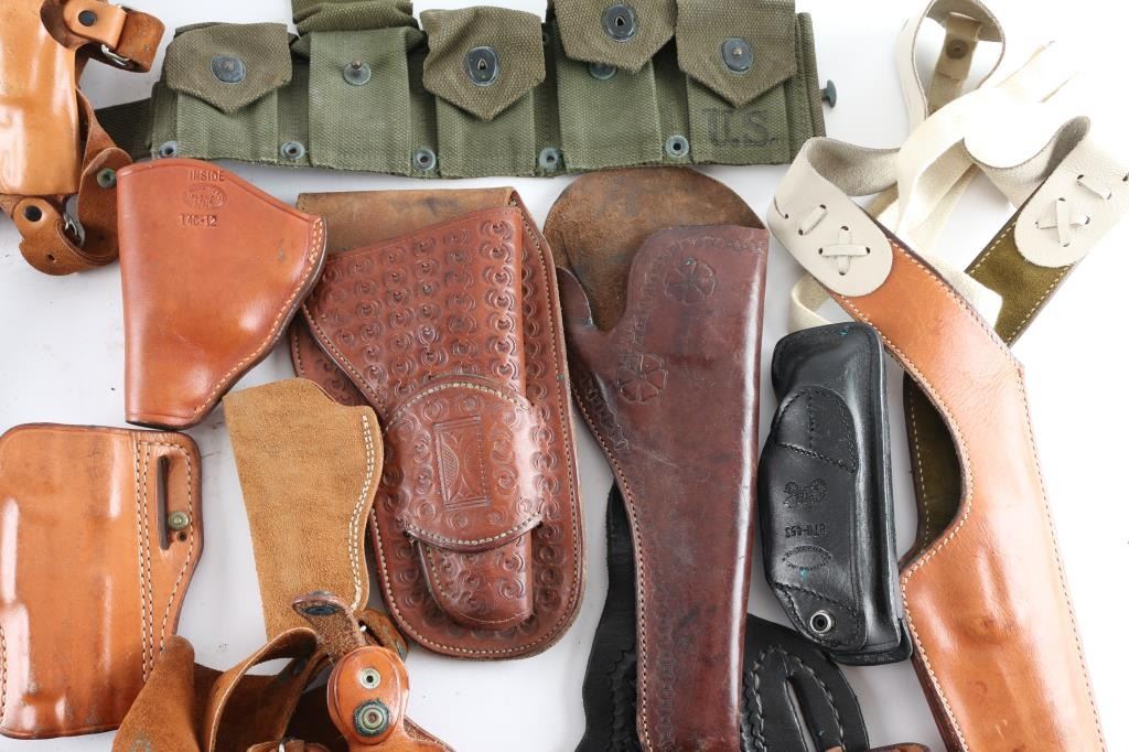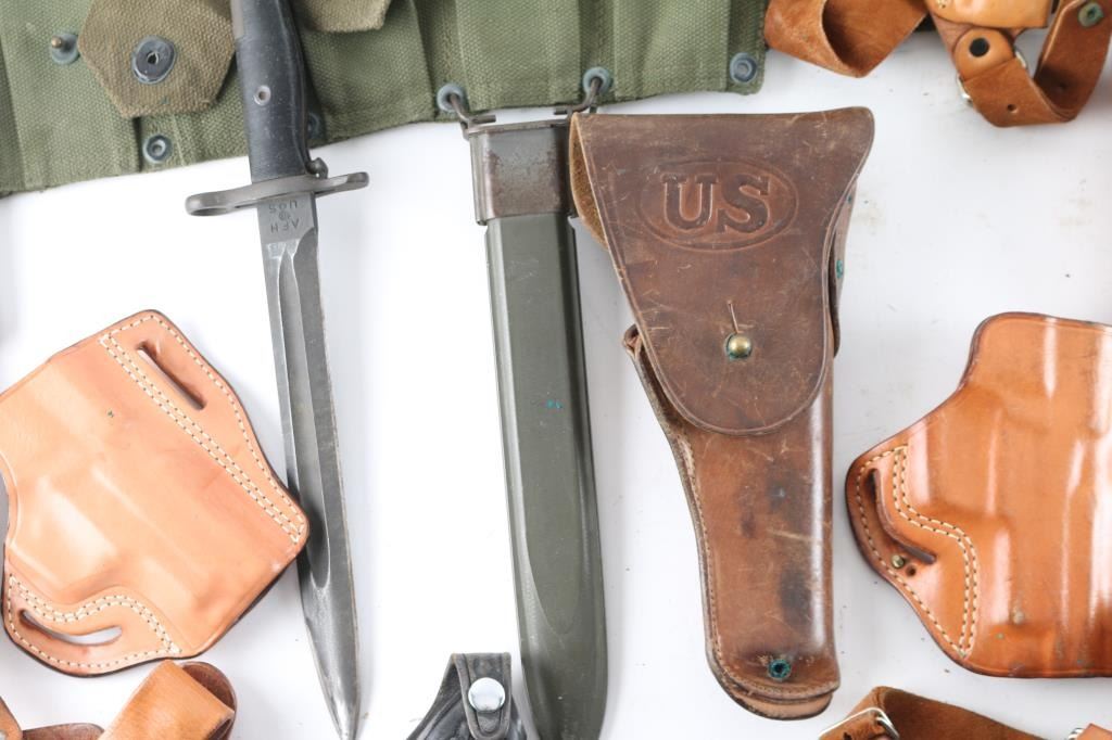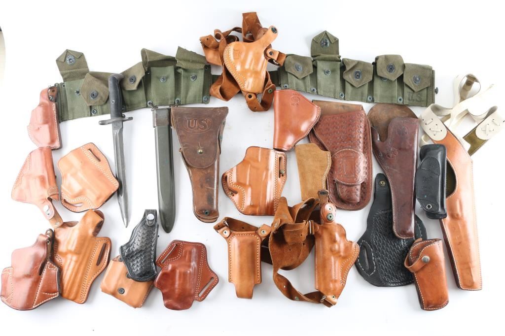 includes over a dozen various leather belt holsters, several pouches, three shoulder holsters, a US ammo belt with clip pockets, US M1 bayonet (10", AFG marked), US 1911 holster (marked "CLINTON 1918 FWT", name "DEATHENE" (?) in pen on back, wire hanger removed).