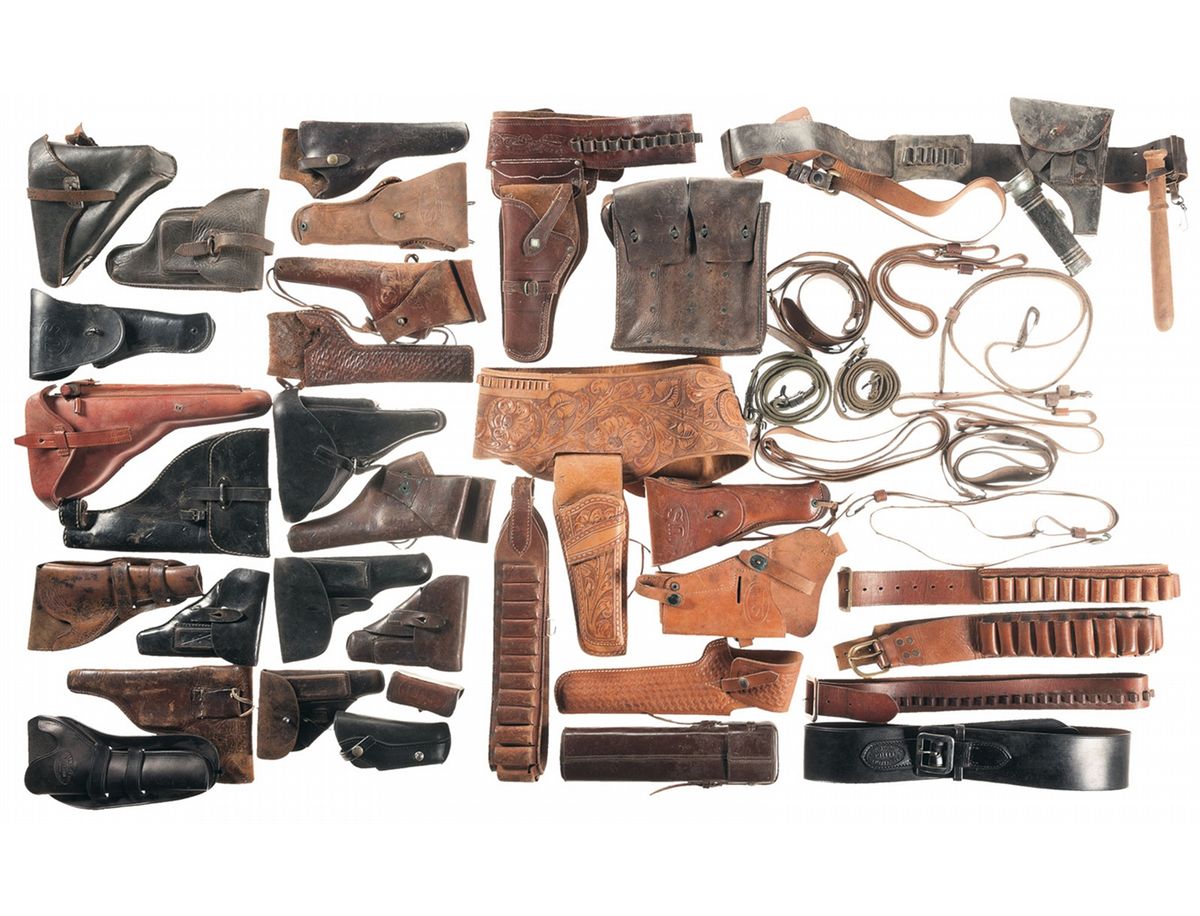 1) Combination of thirty-eight European and American style holsters with thirty-six leather, one nylon, one canvas and one with a belt. Some of the holsters have magazine pouches and one has two magazines and a tool. 2) Two saddle holsters. 3) One leather scope case. 4) One leather pouch with strap. 5) One stick with plastic handle measuring 36 inches overall. 6) Ten belts with bullet loops, three of them with holsters attached and one with a holster, flashlight and billy club. 7) Ten slings, nine of them leather and one canvas. 8) Five belts, two of them leather and three of them military style canvas. 9) One leather ammo pouch. 10) Leather flashlight holster. Overall good to very good.