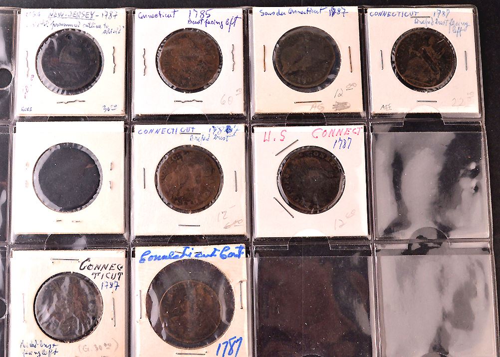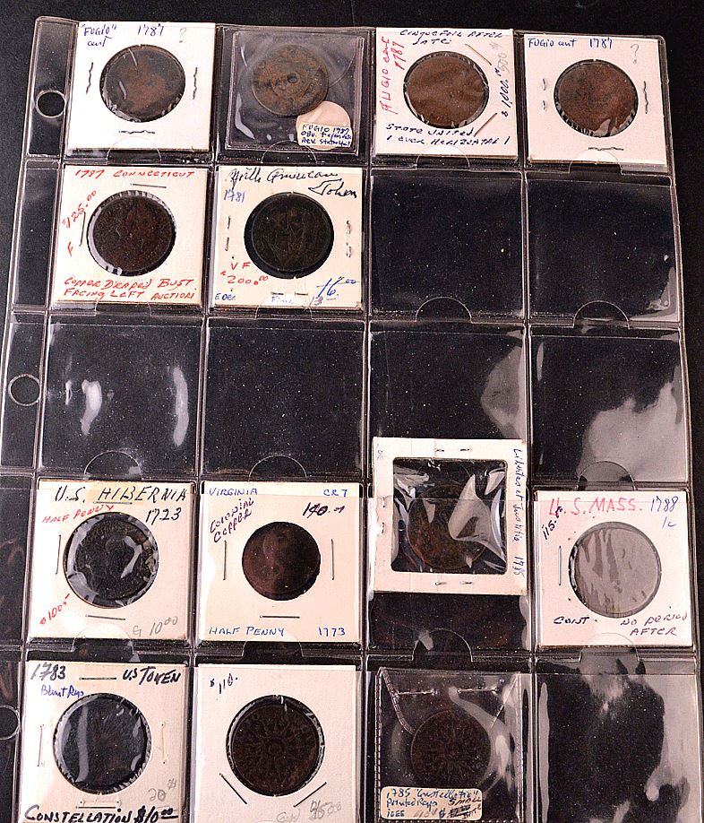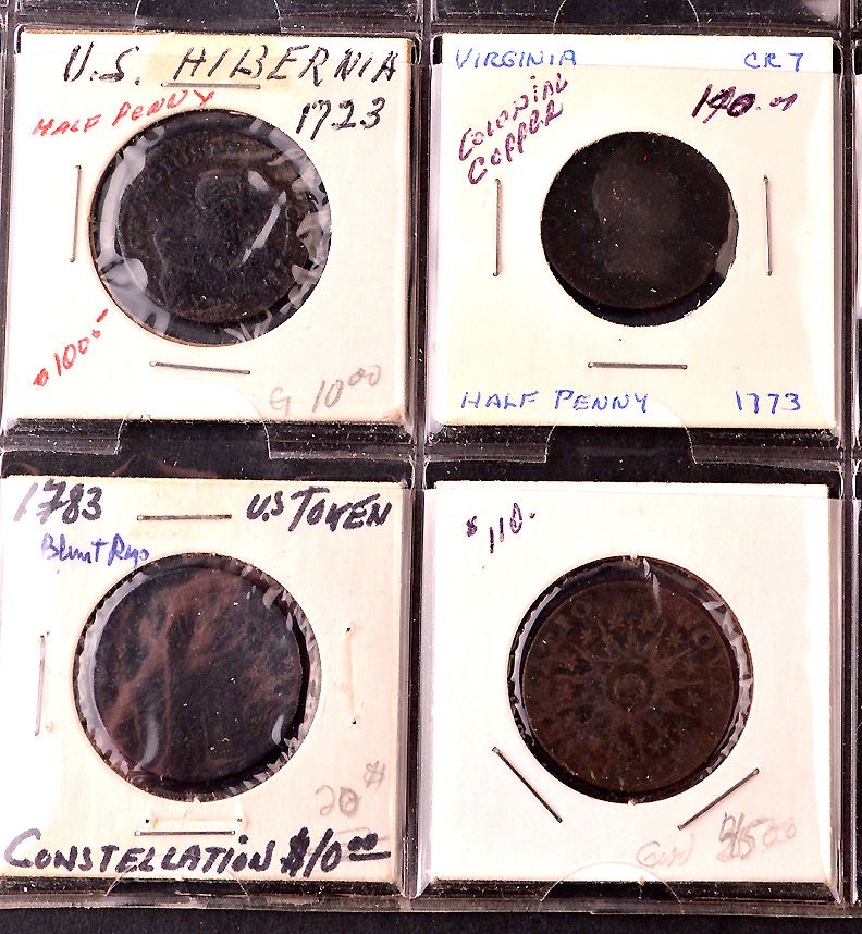 Wood's Hibernia, Half Penny, 1723; Virginia, Half Penny, 1773; Nova Constellatio Coppers, 1783; 1785, (3); Massachusetts, Cent, 1788; Connecticut, 1785 to 1787, (9); New Jersey, 1787, holed; Fugio Cents, 1787, (4), one holed; North American token, 1781; grades range from Poor to VG, most Filler to Good; total of 22 pieces. Should be viewed.