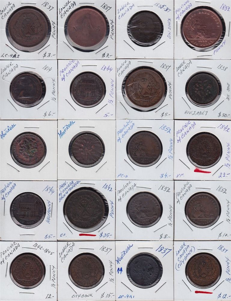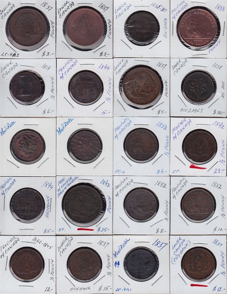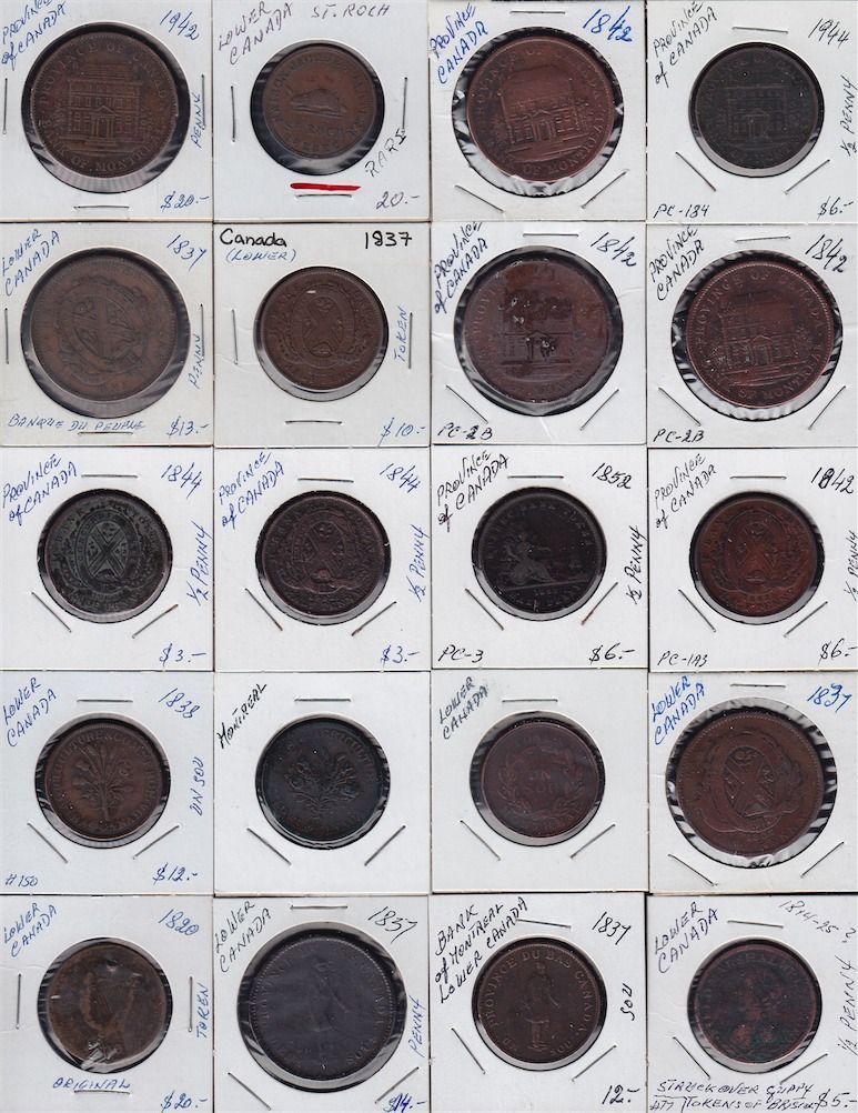Large Lot of Lower Canada Tokens - Ideal for study, this lot is a diverse mix of tokens from Lower Canada, some are cleaned and damaged, other are very presentable and collectible. No return. 134 Pcs.