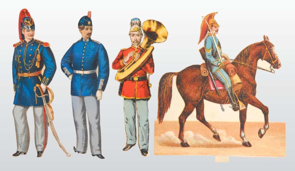 Description ND. This large album holds more than 800 military figures from the late 1800s into the 20th century. There are Rough Riders, Highlanders, British Regulars, Zouaves, French Military, US Military and many, many figures printed by the McLoughlin Company.